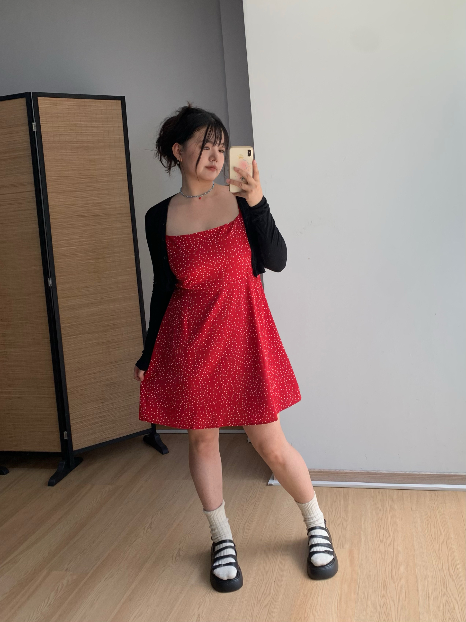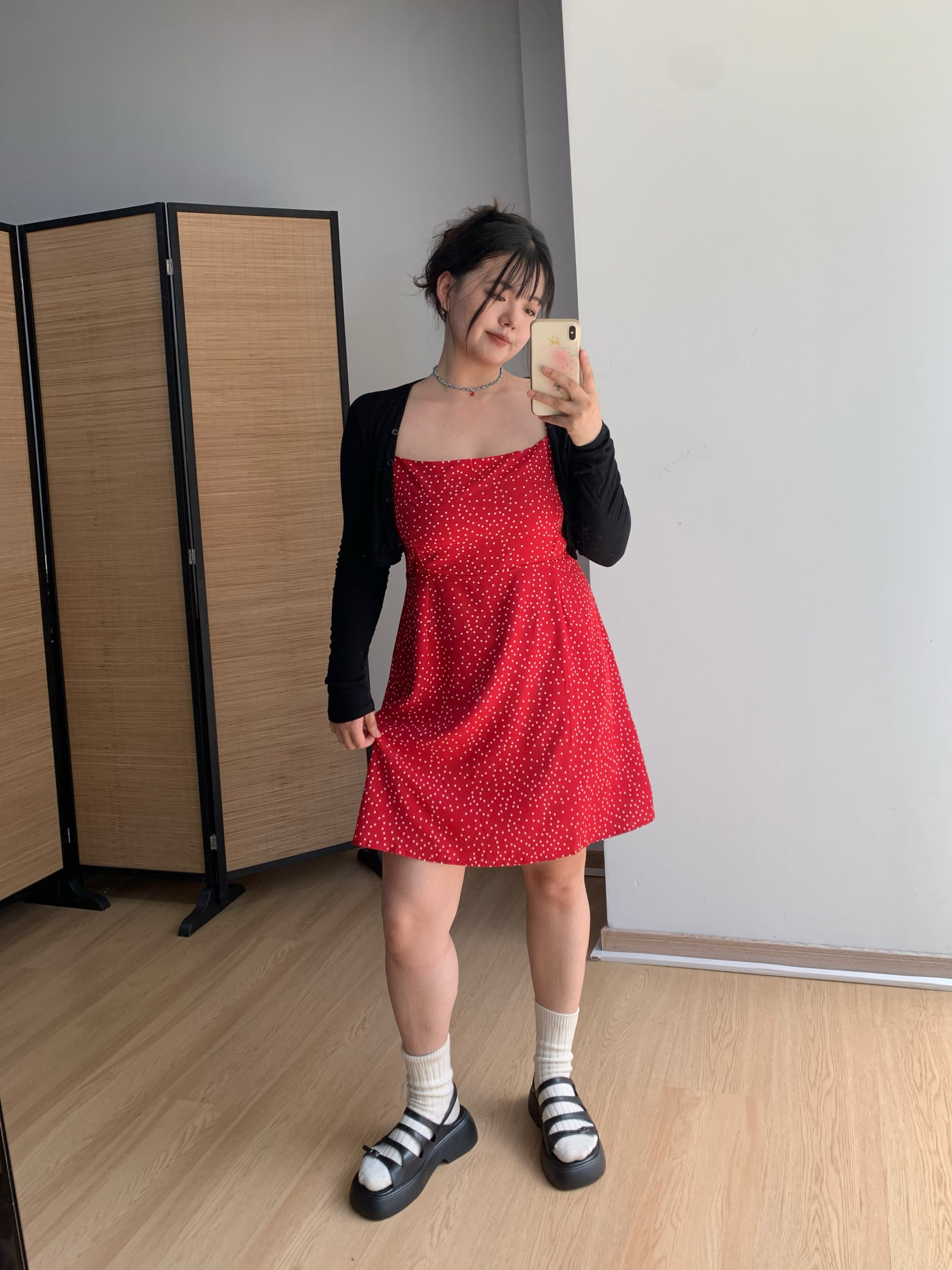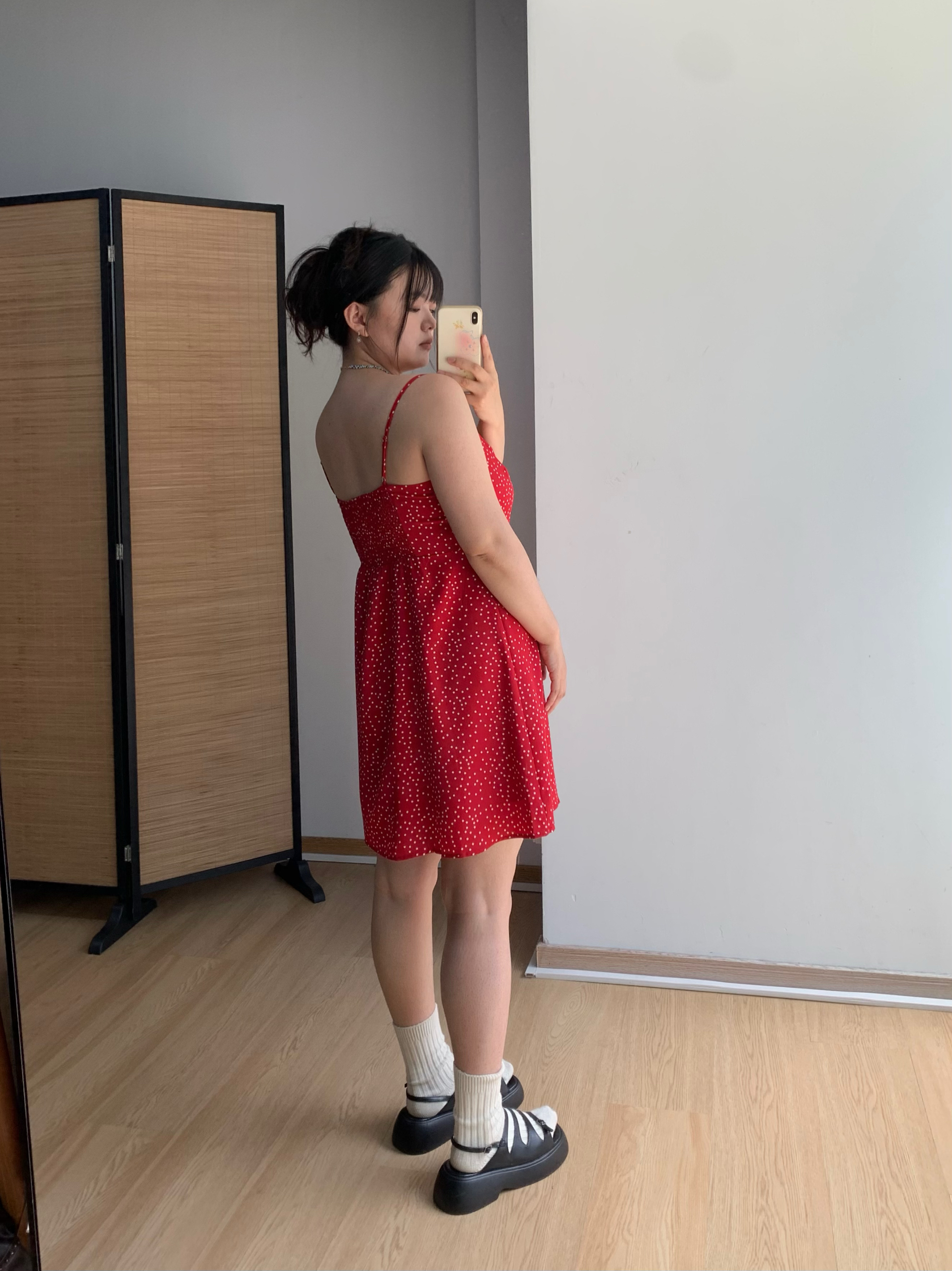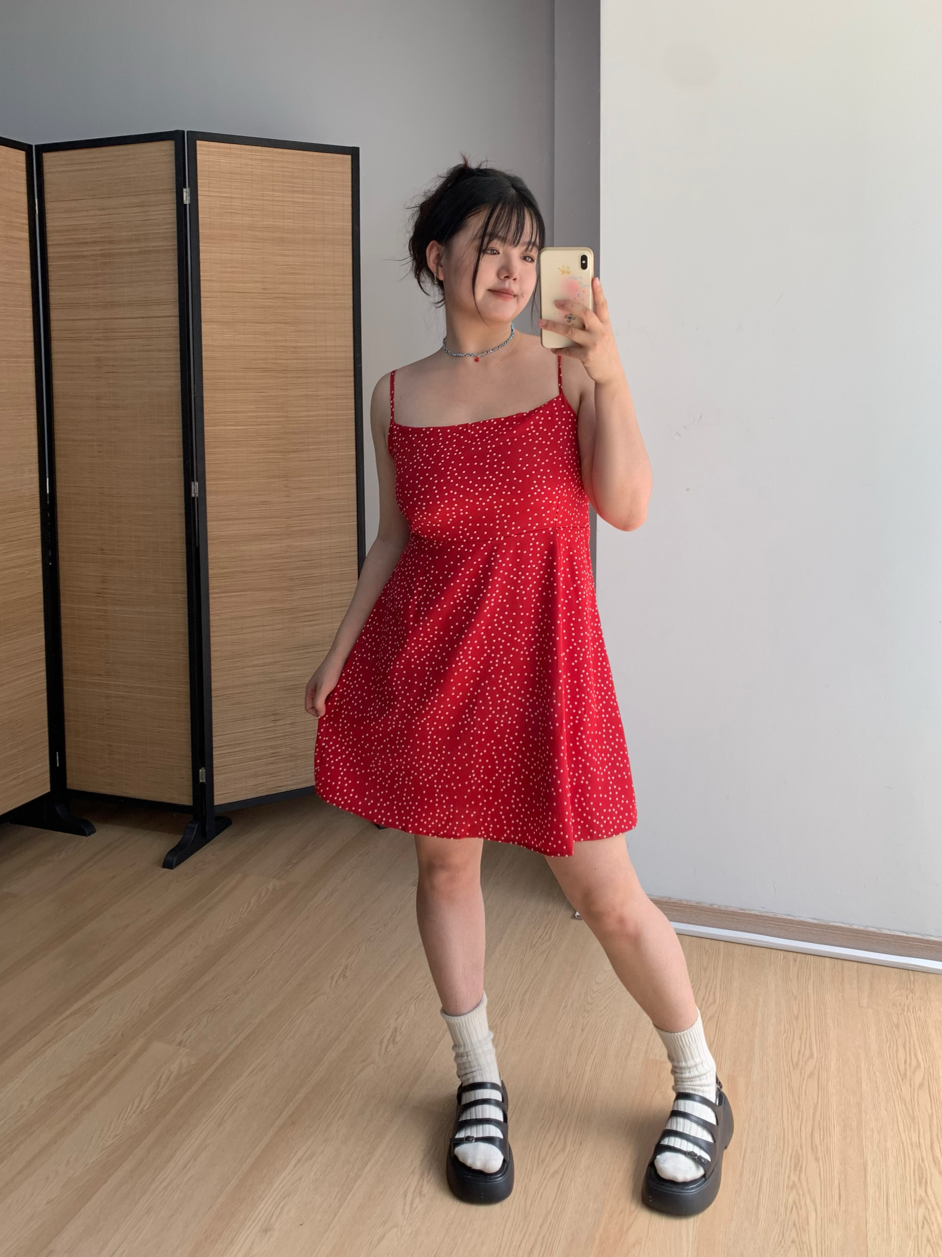 胖MM 吊带裙甜美风出游连衣裙女夏季 FishCake大码 微胖红色波点短款