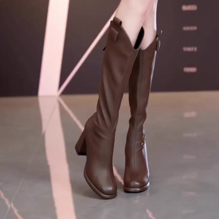 真皮 骄屿褶皱堆堆靴两穿可翻折棕色长筒靴粗跟厚底不过膝骑士靴