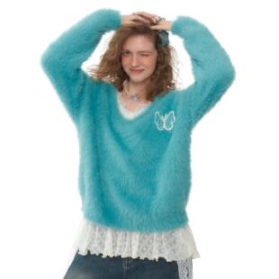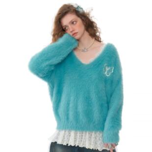 ziziFei秋冬美式 复古高级感毛毛宽松软糯蓝绿色慵懒套头V领毛衣女