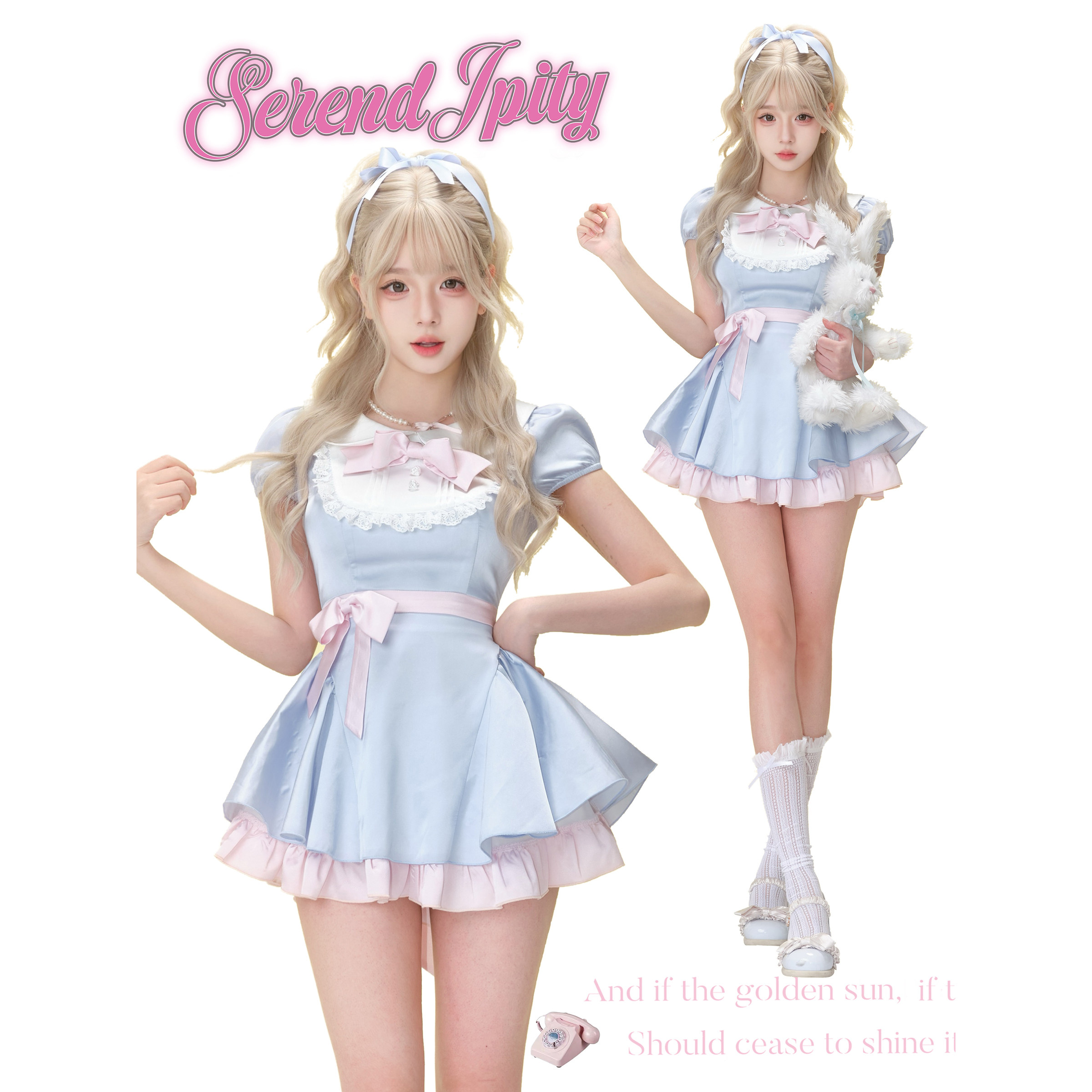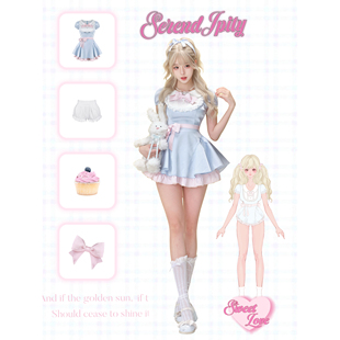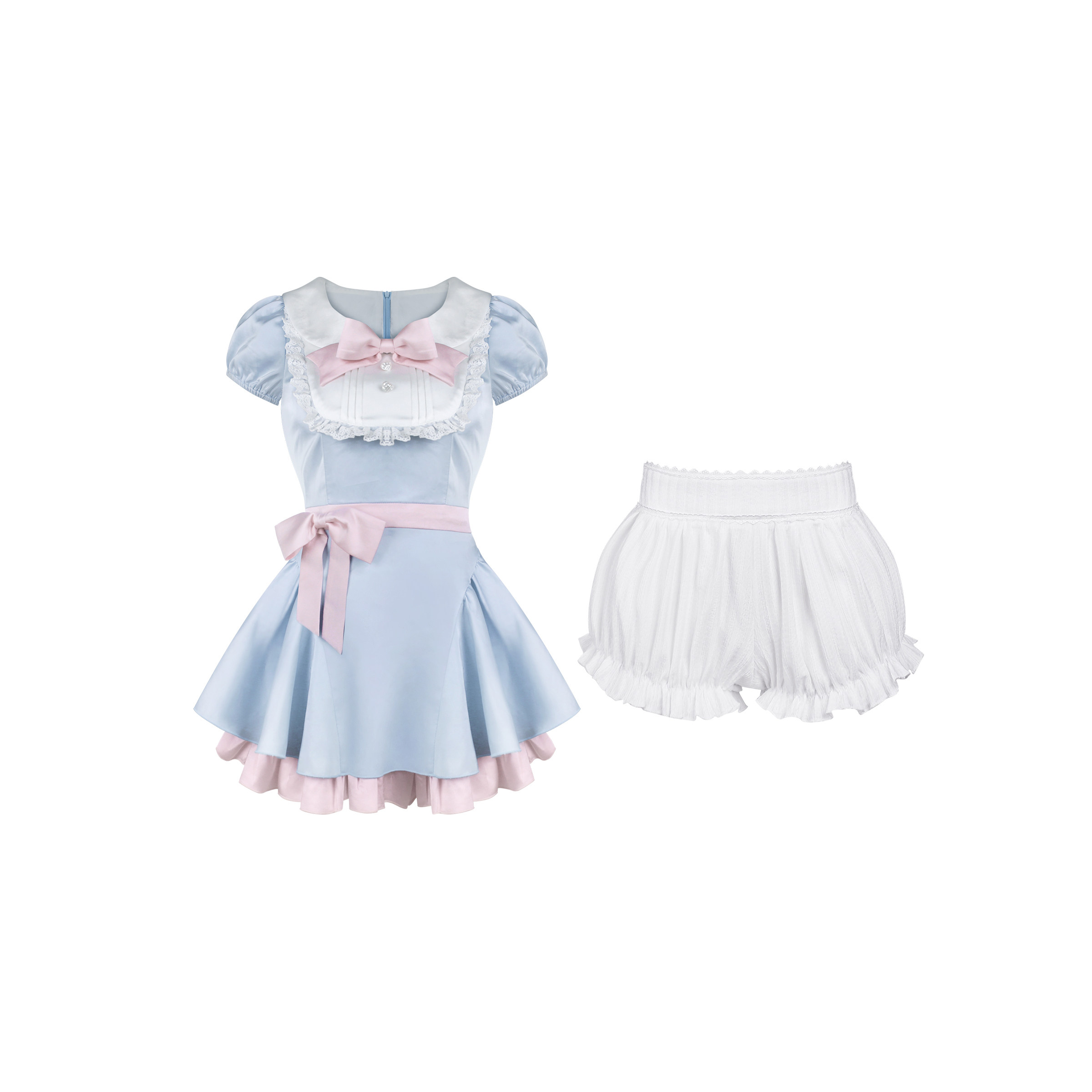 白色泡泡短裤 少女椰子 蓝色连衣裙送蝴蝶结 月光洛可可 千金系