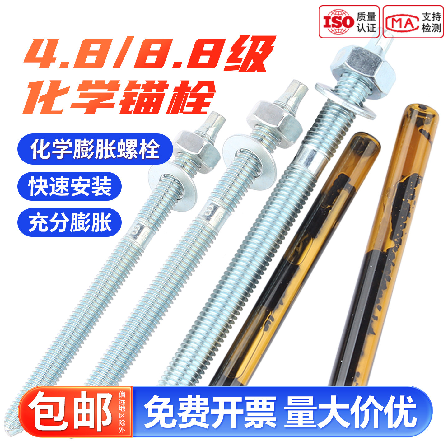 4.8化学膨胀螺栓高强度8.8级镀锌加长化学锚栓螺丝含药剂12M16M20