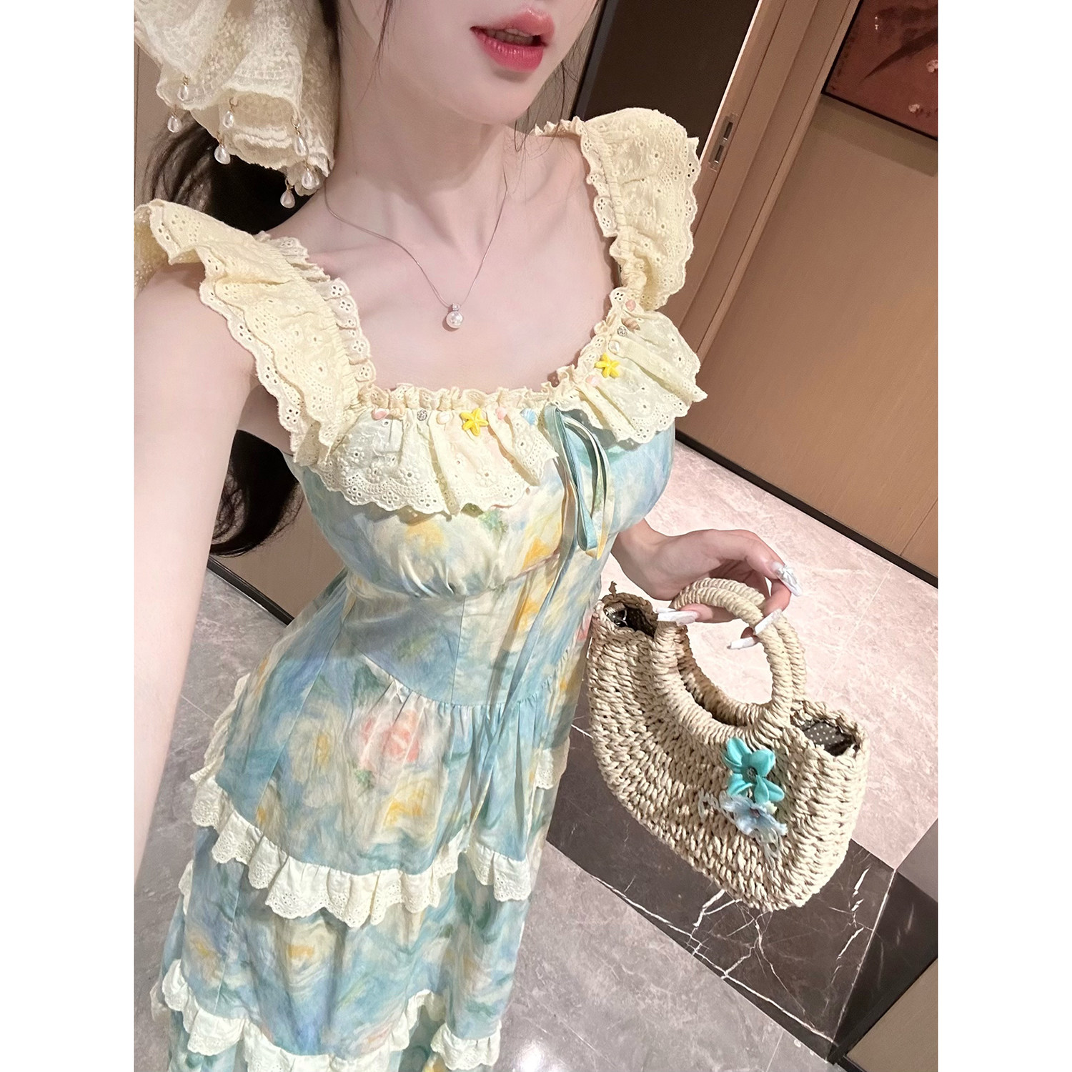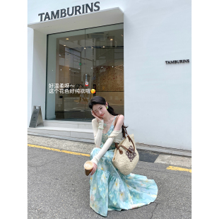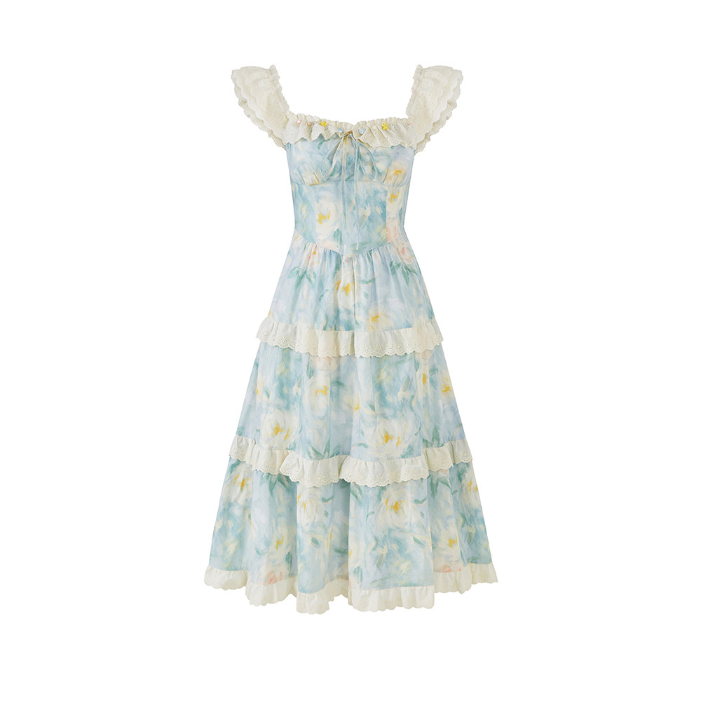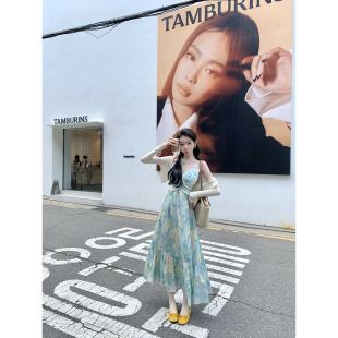 Sun雅乔 田园风度假全棉印花油画荷叶边吊带连衣长裙 海盐花信