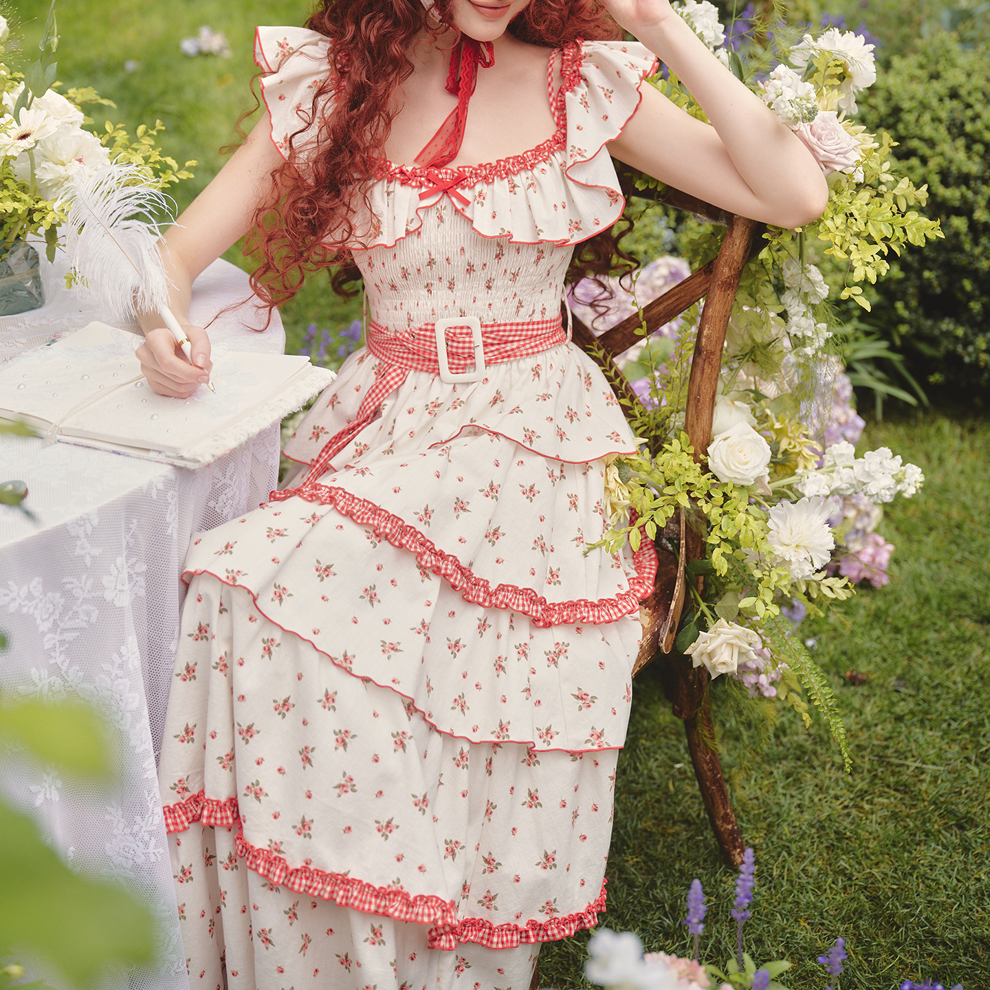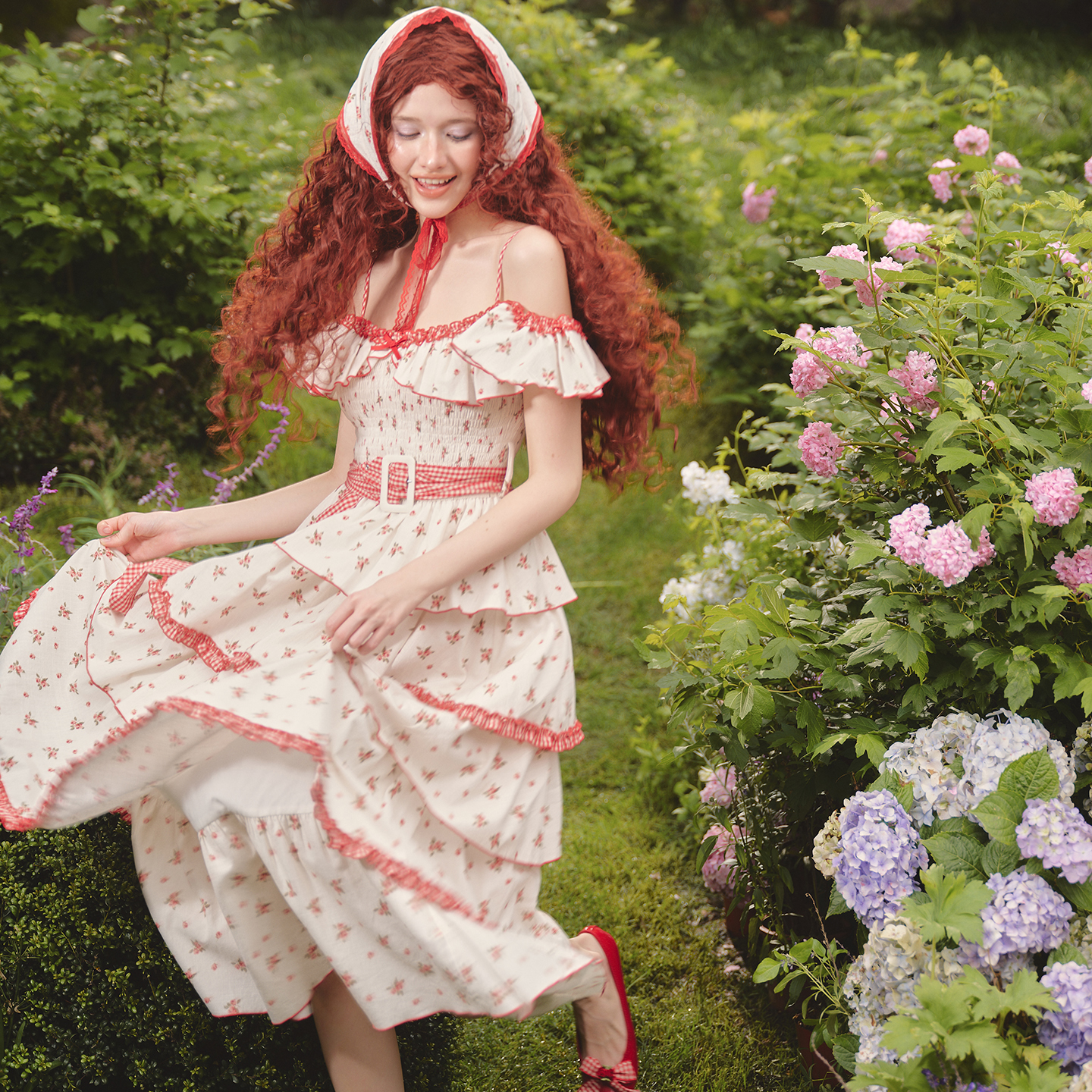 田园风连衣裙碎花蛋糕塔裙长款 法式 收腰两穿夏女 小红帽 LaceMade