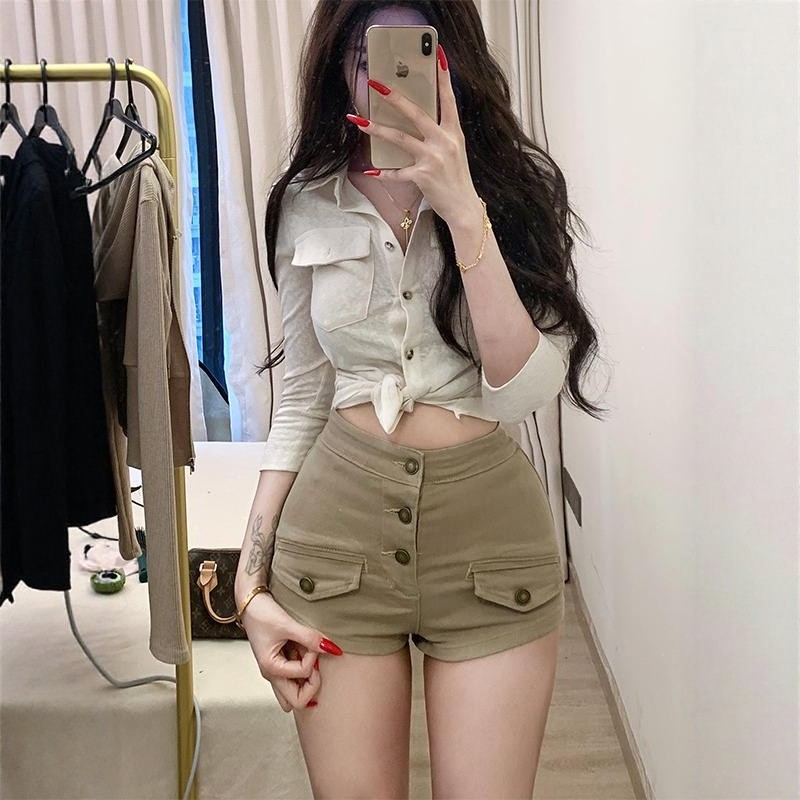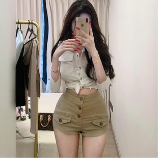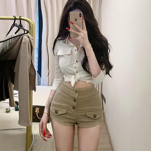 多扣高腰紧身显瘦包臀热裤 新款 女2025冬季 老钱风纯欲丰胯牛仔短裤