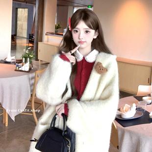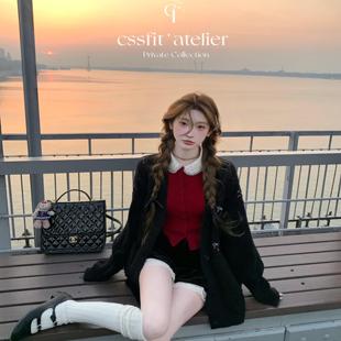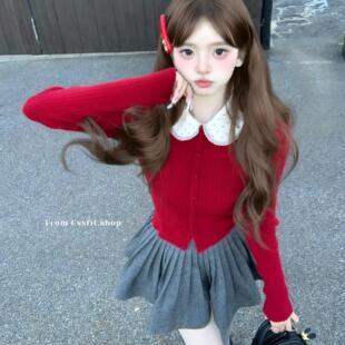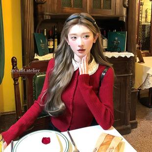 针织开衫 圣诞红波点蕾丝翻领修身 上衣女 Christmas恋人 迟伞伞
