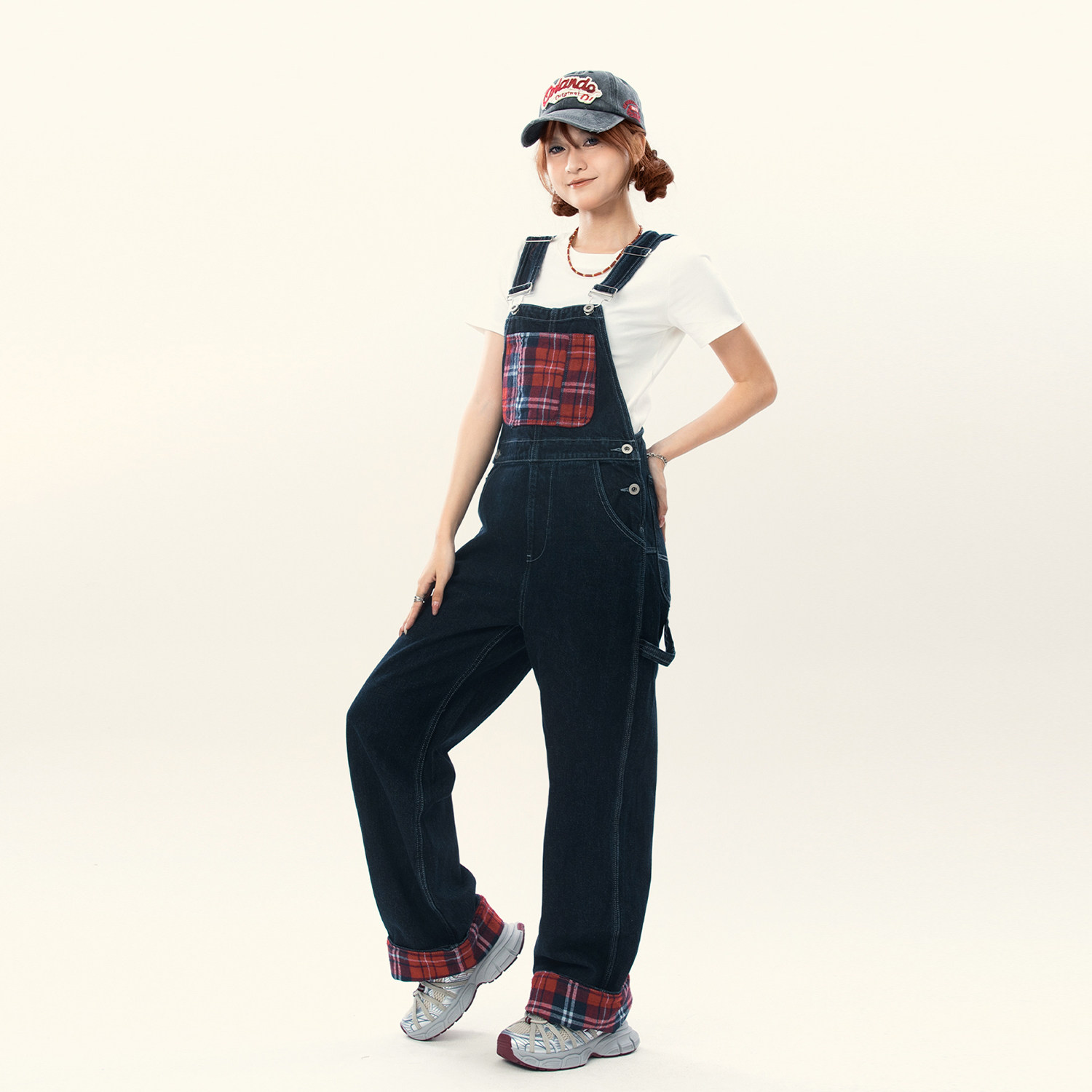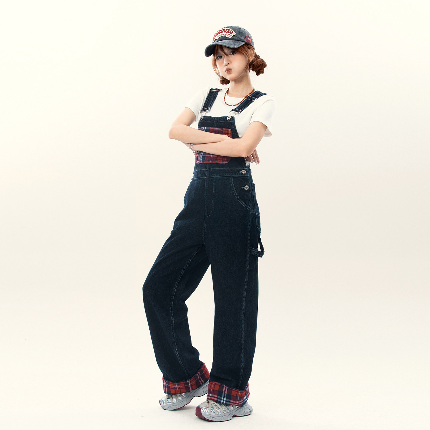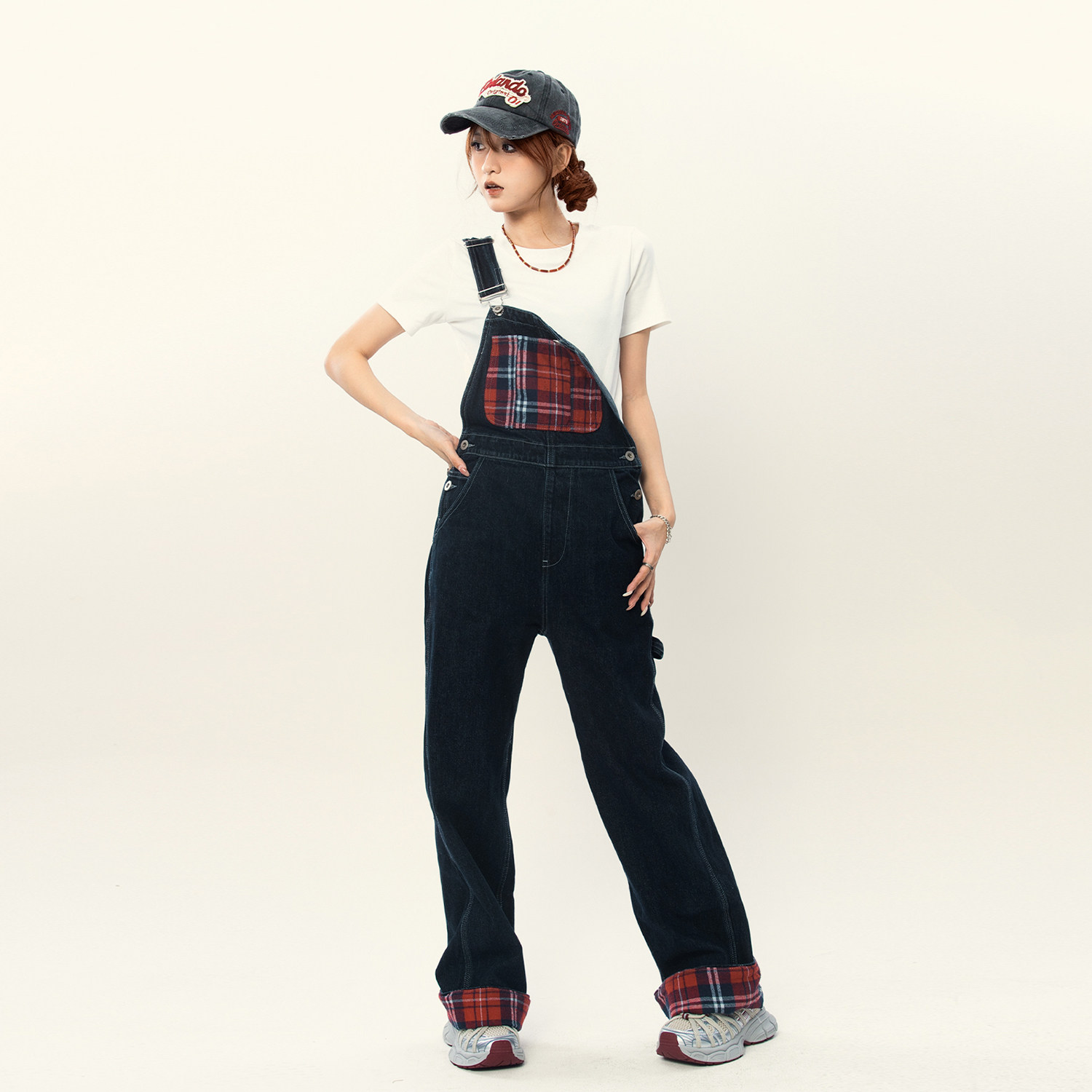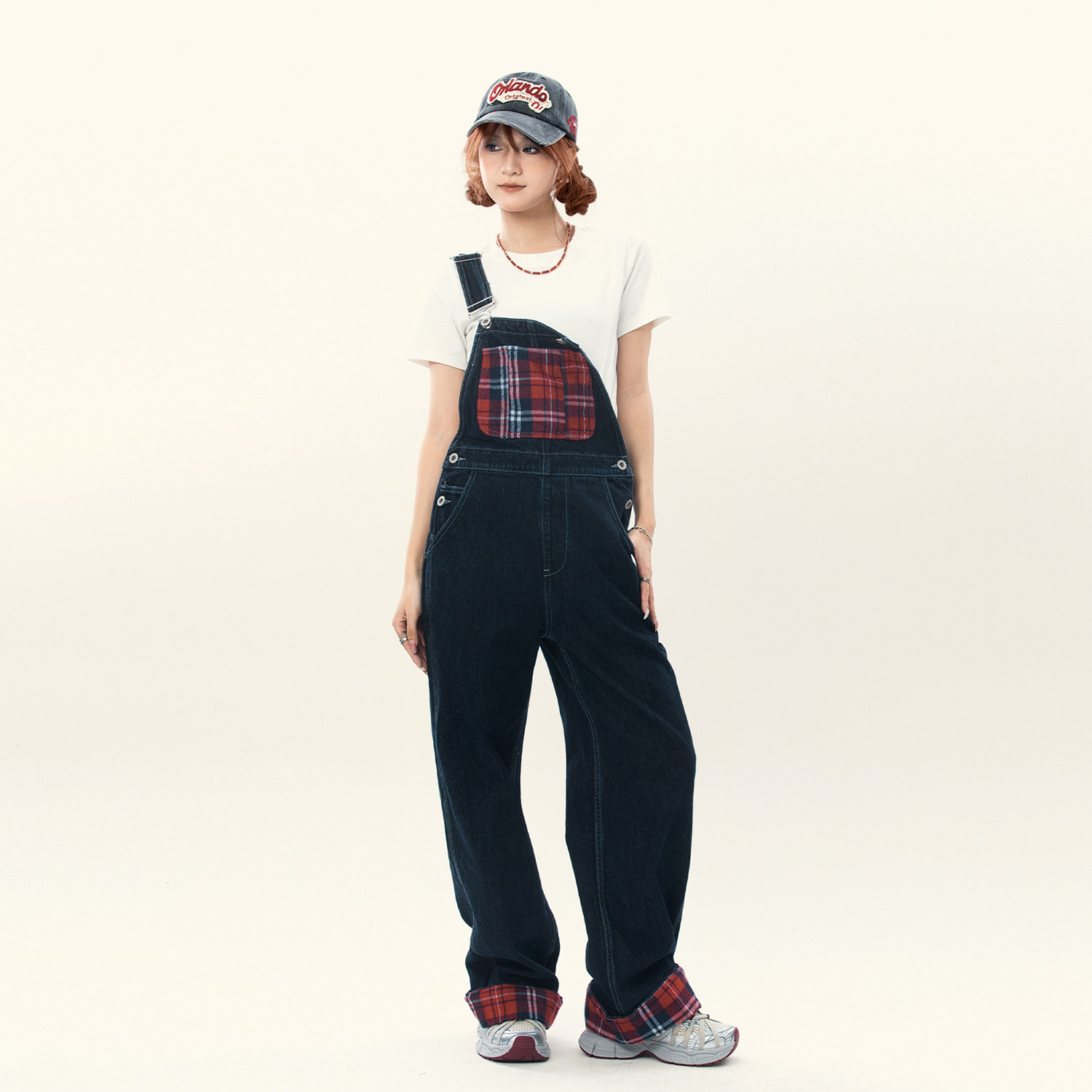 裤 男女宽松直筒街头百搭设计感工装 潮 格纹复古翻边拼接背带裤 美式