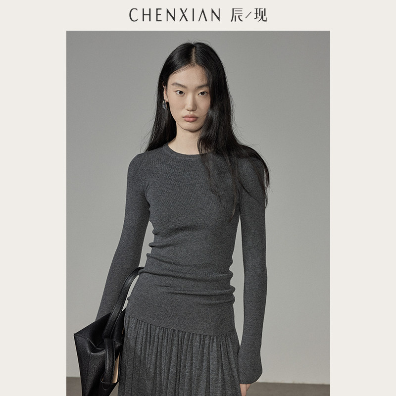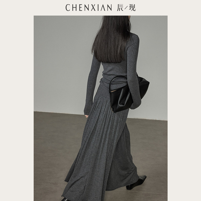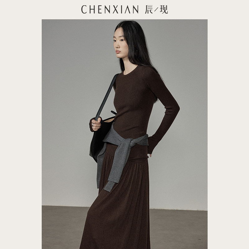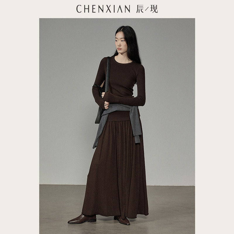 设计感百褶半身裙长款 毛衣套装 女 修身 CHENXIAN辰现圆领羊毛针织衫
