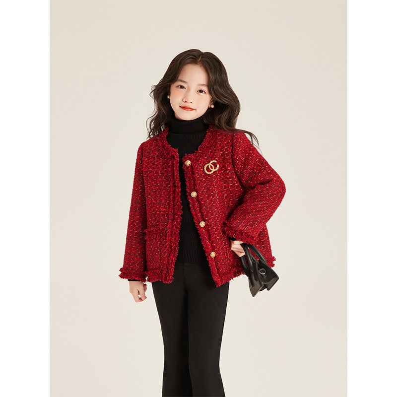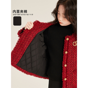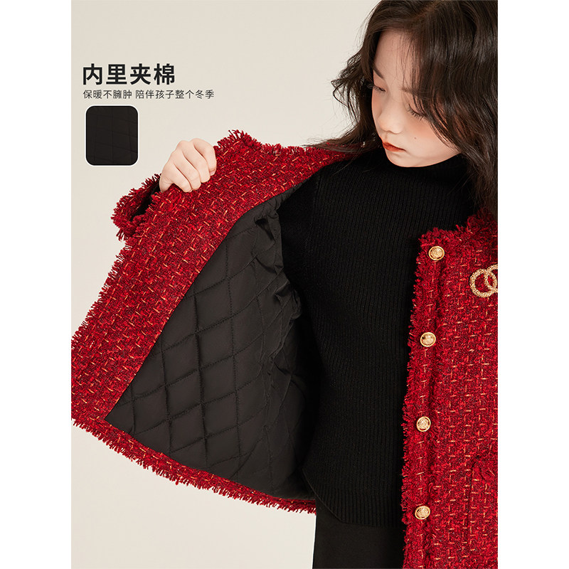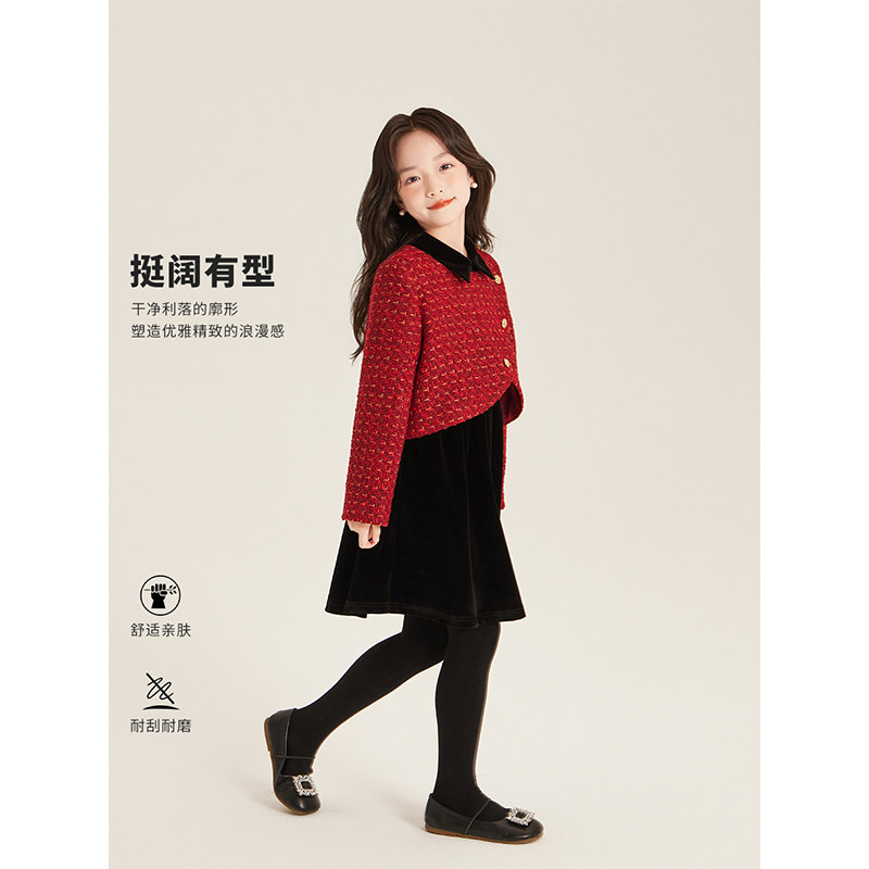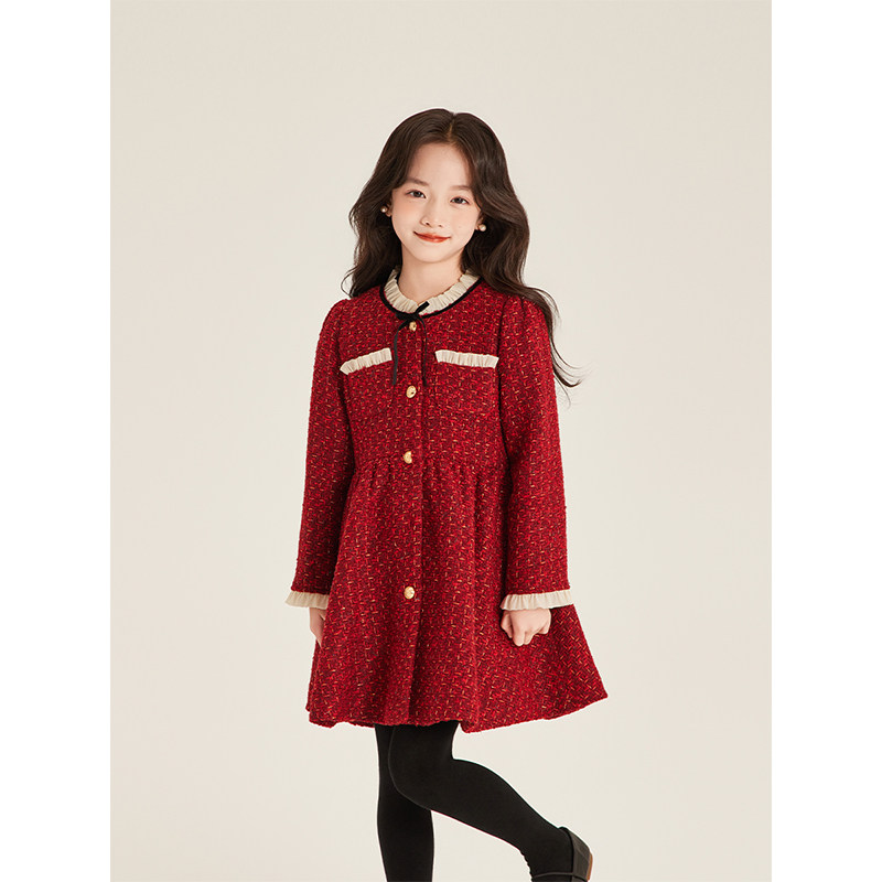 红色小香风高级连衣裙呢子夹棉外套 2025新款 Amybaby女童套装 冬季