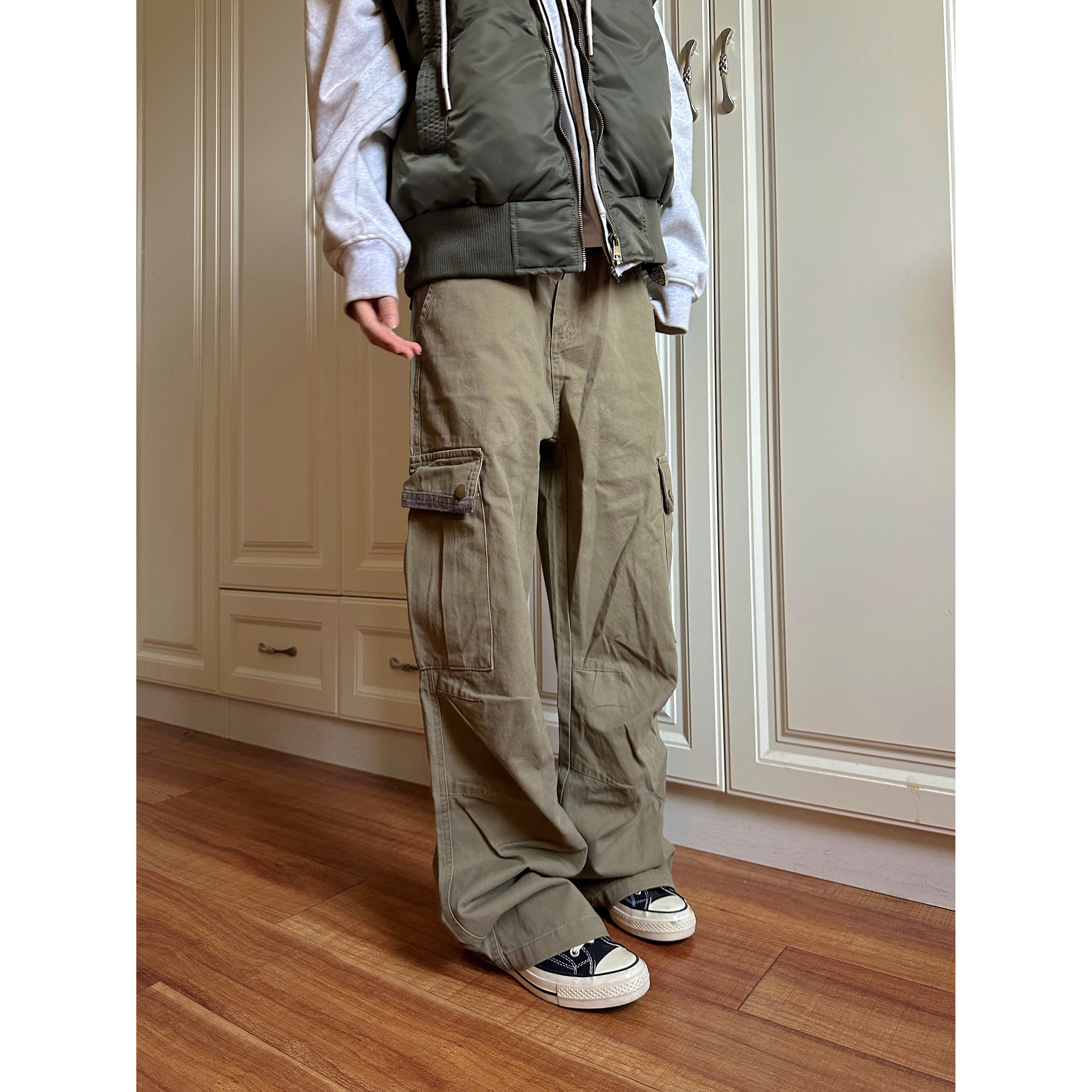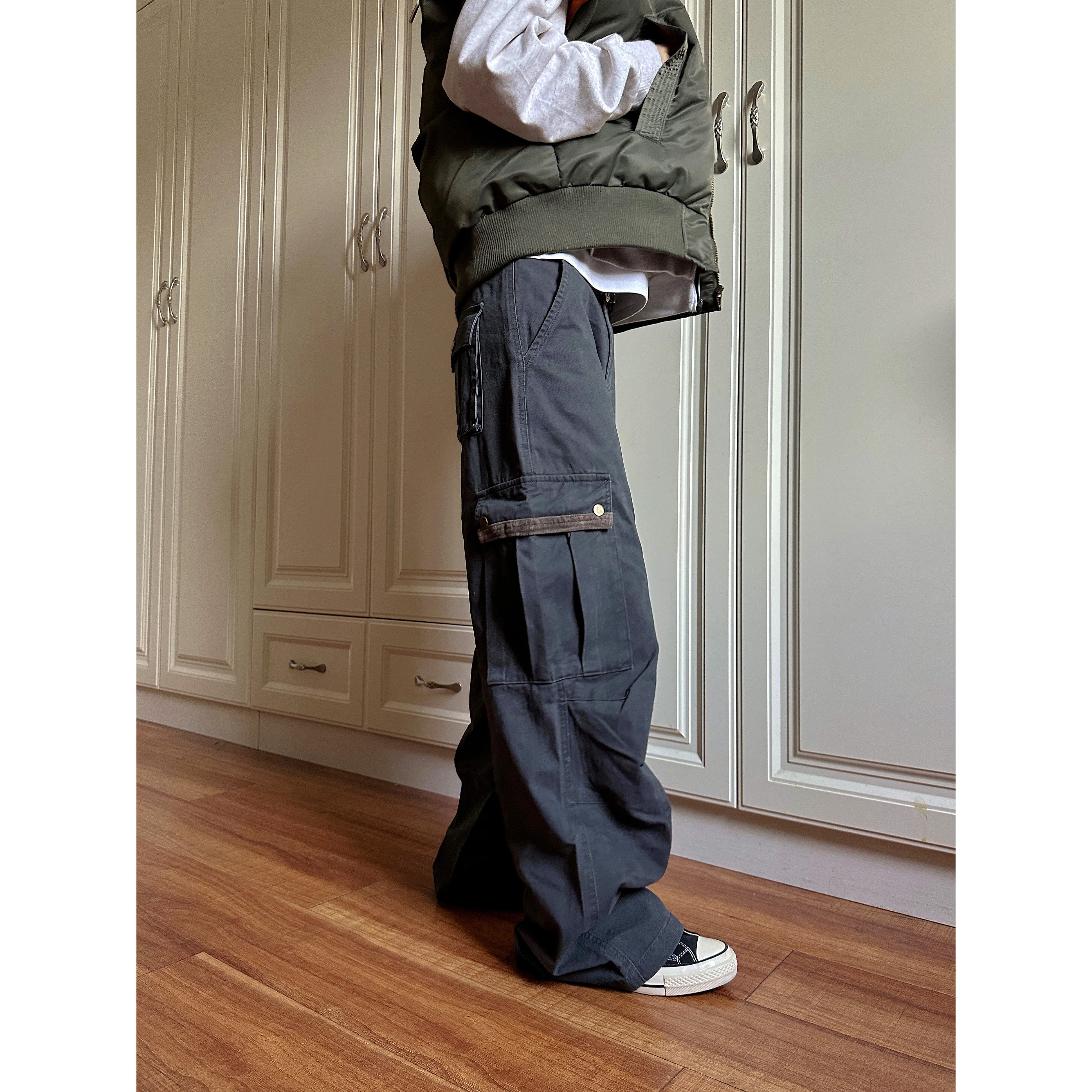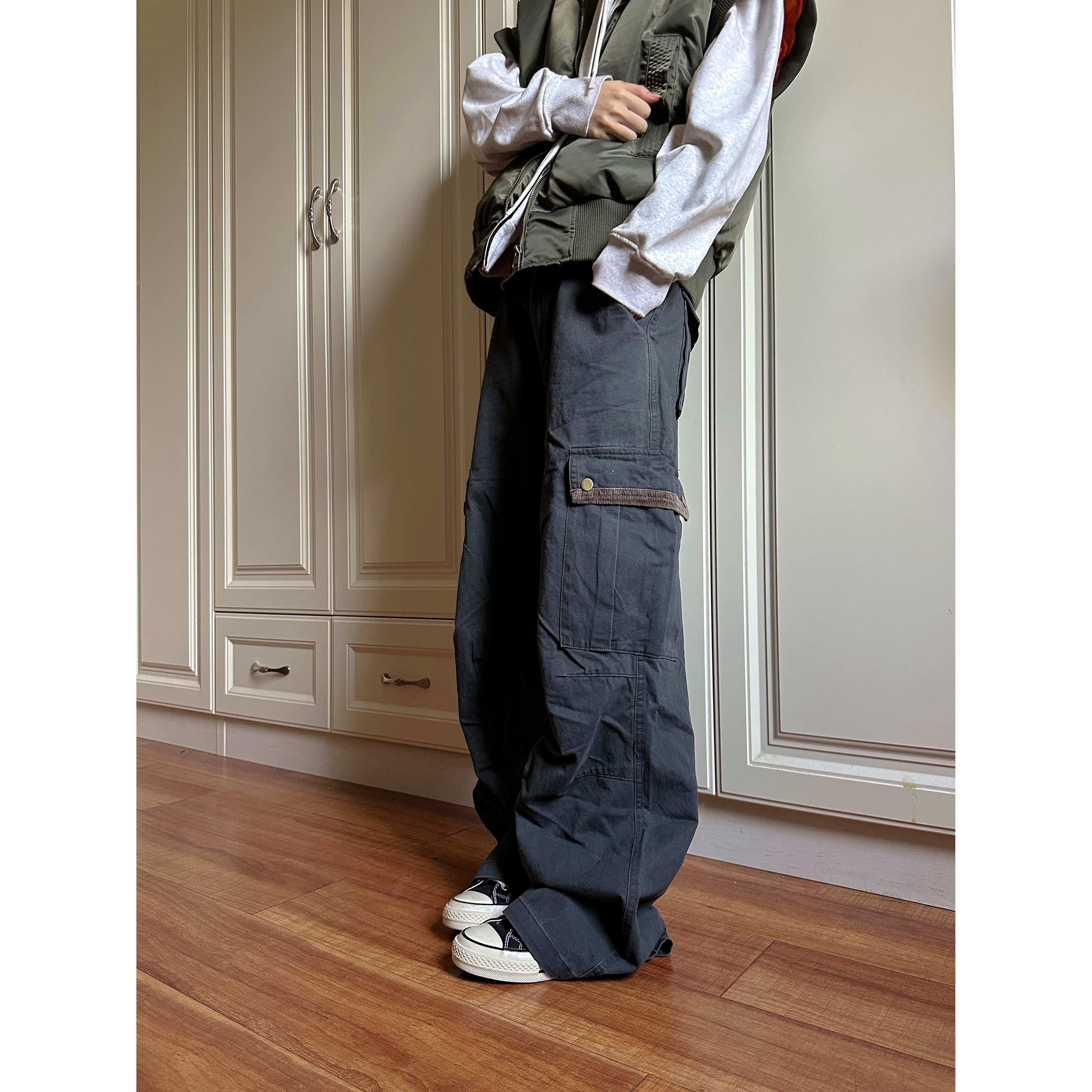 多口袋男女ins 裤 F383 2024美拉德复古做旧灯芯绒拼接宽松直筒工装