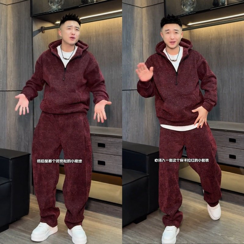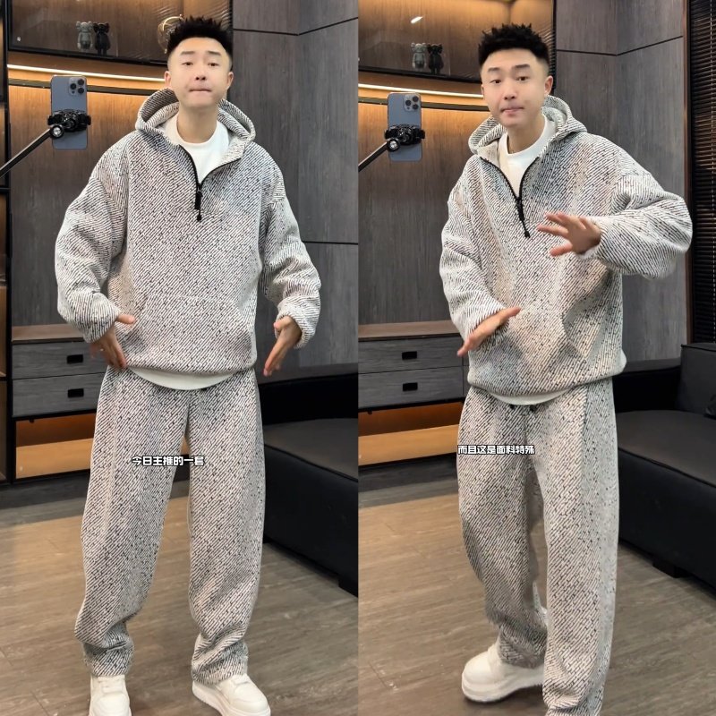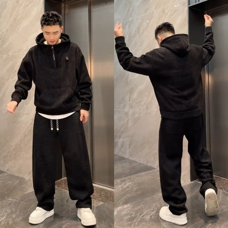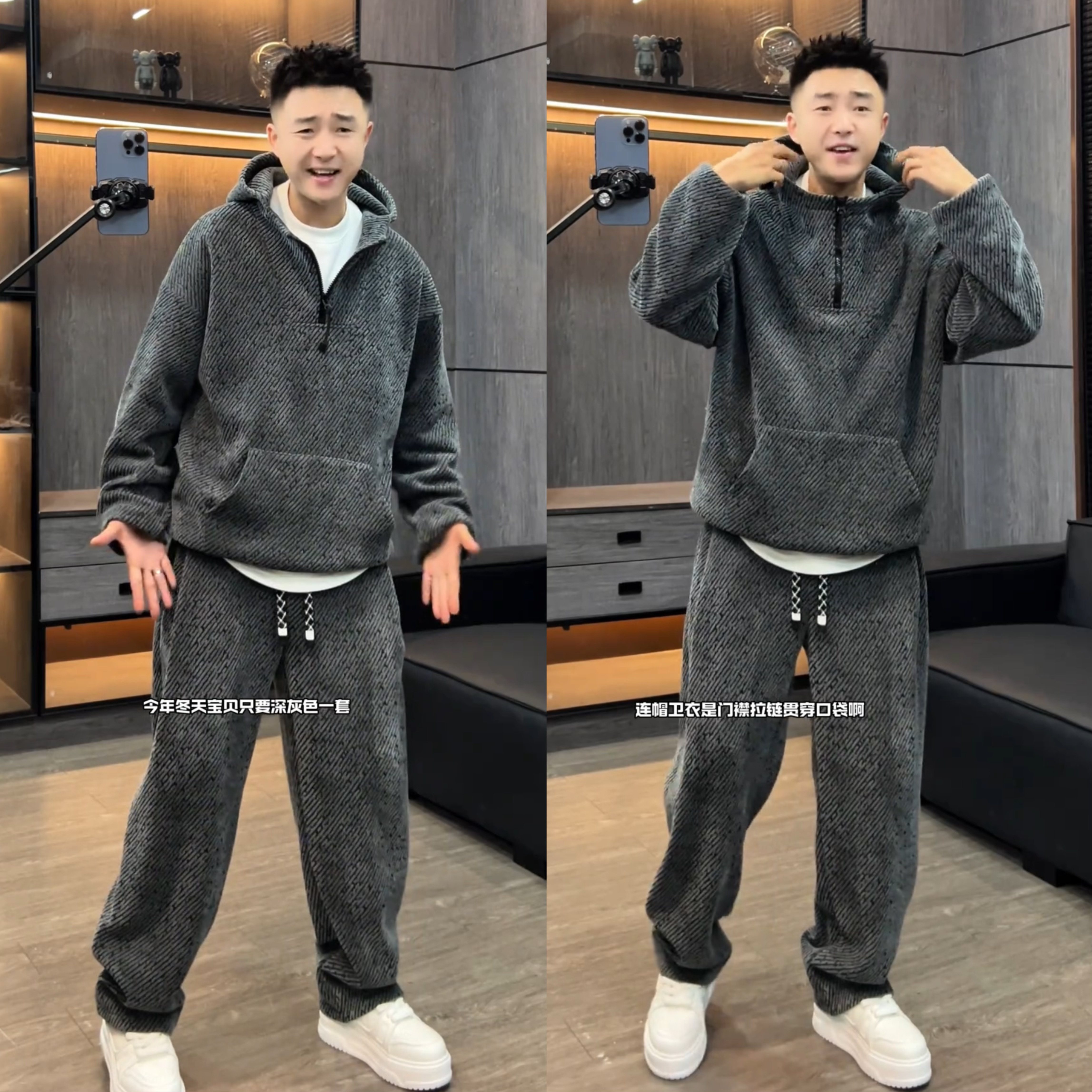 休闲套装 加厚时尚 男士 银丝斜条纹半拉链帽衫 两件套 秋季 休闲裤 新款