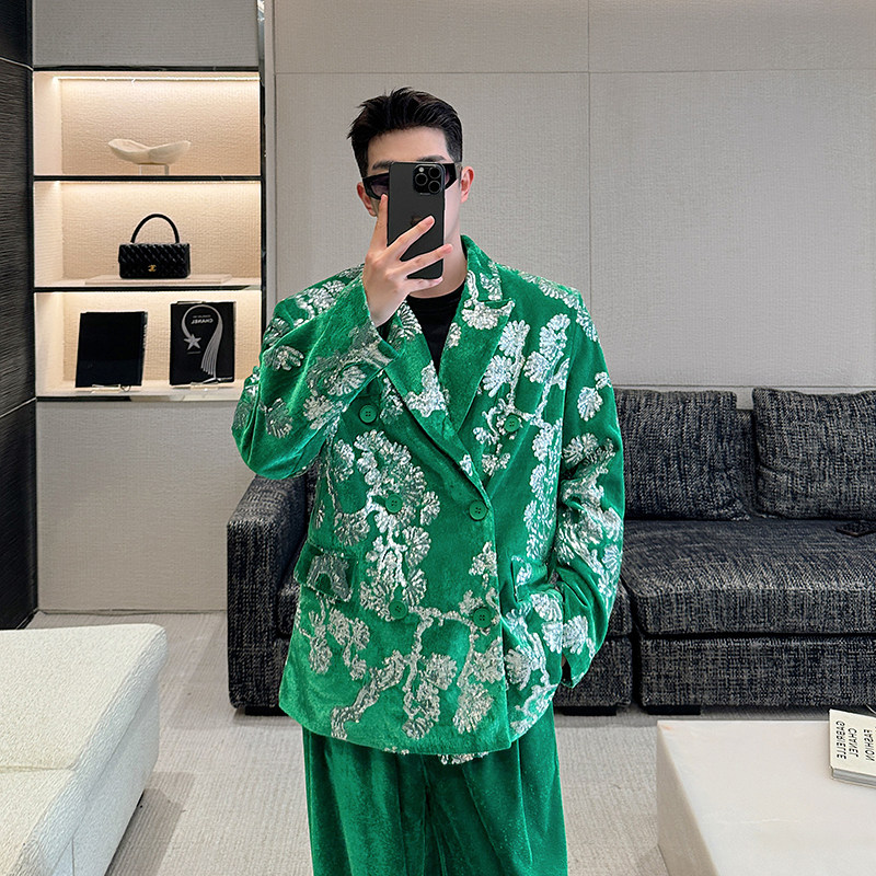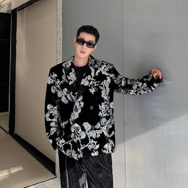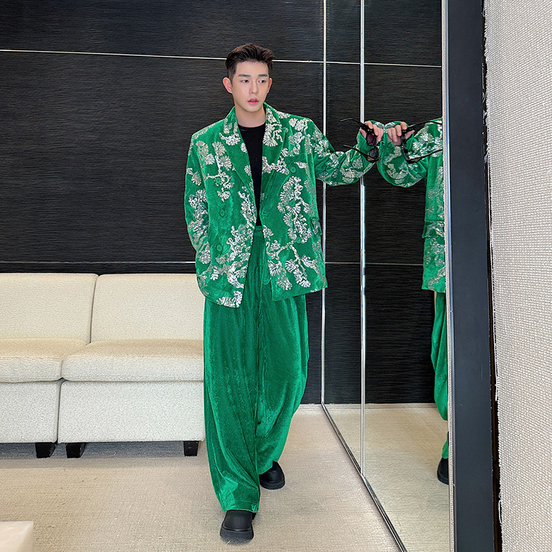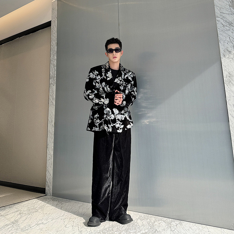 男气质设计感阔腿长裤 ins复古刺绣亮片丝绒西服套装 潮 走秀款 时尚