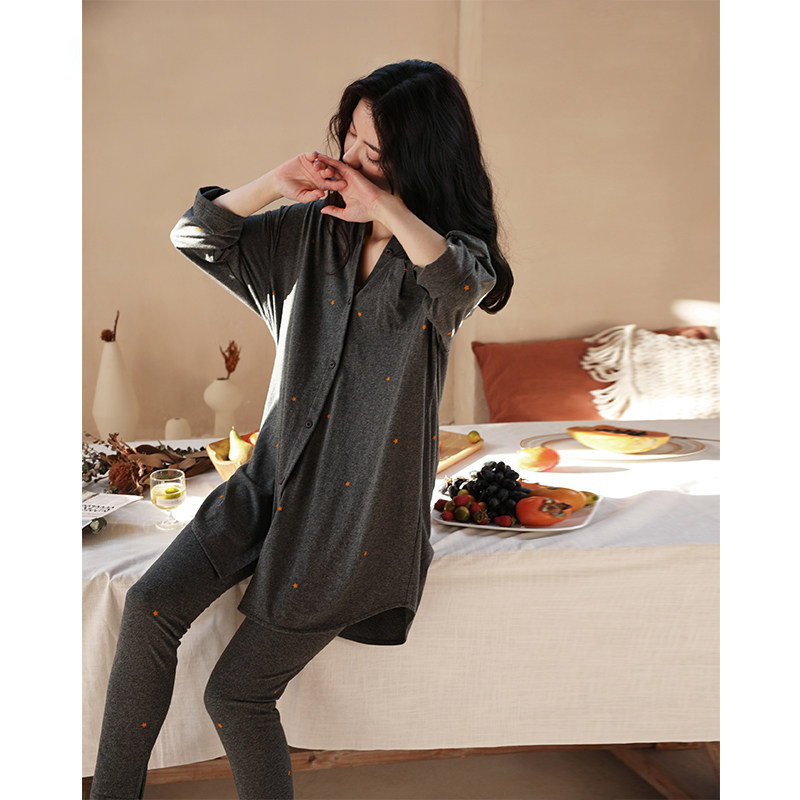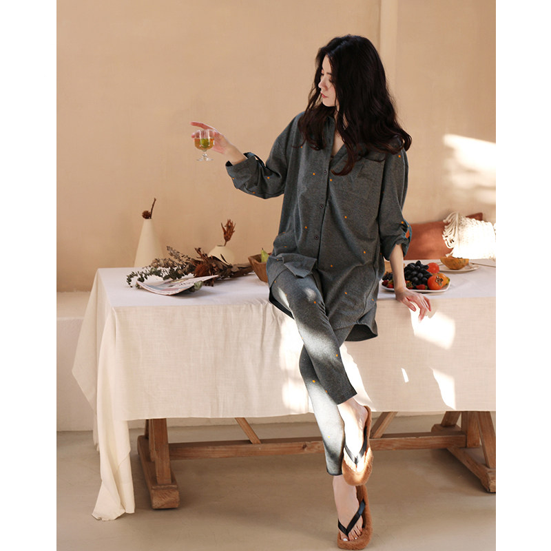 中长版 纯棉长袖 衬衫 款 家居服 HEARMES 显瘦显高小脚裤 睡衣女春秋季