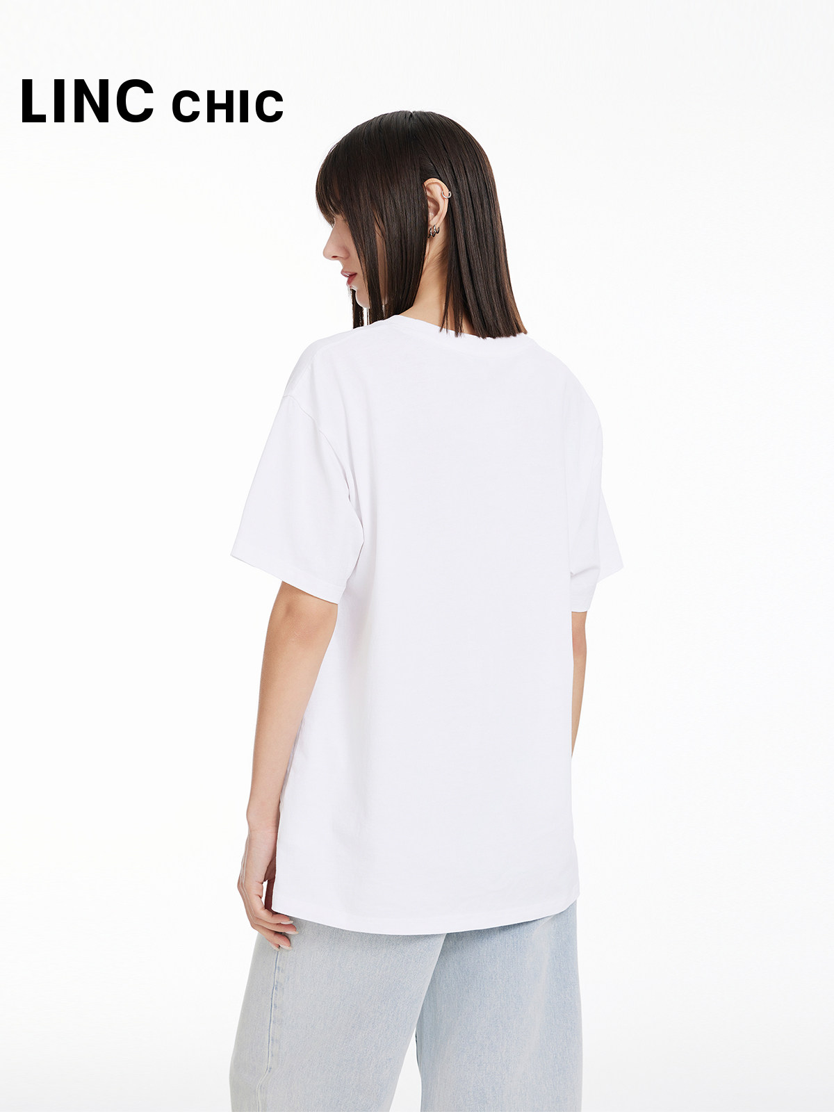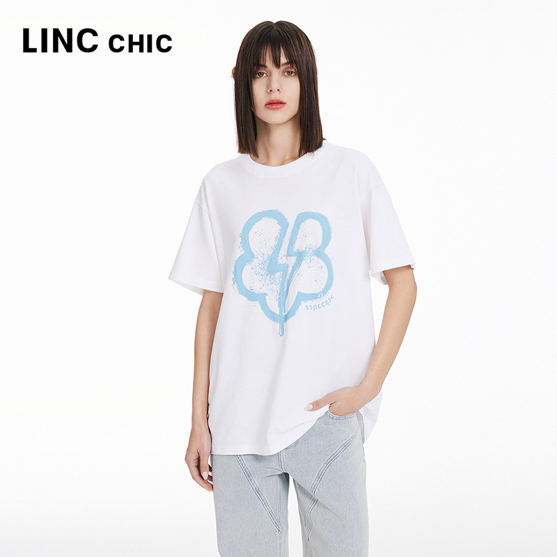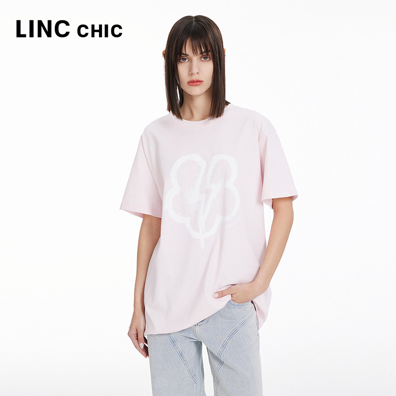 LINCCHIC金羽杰2024年春夏季 体恤女S241TS033 圆领廓形印花短袖