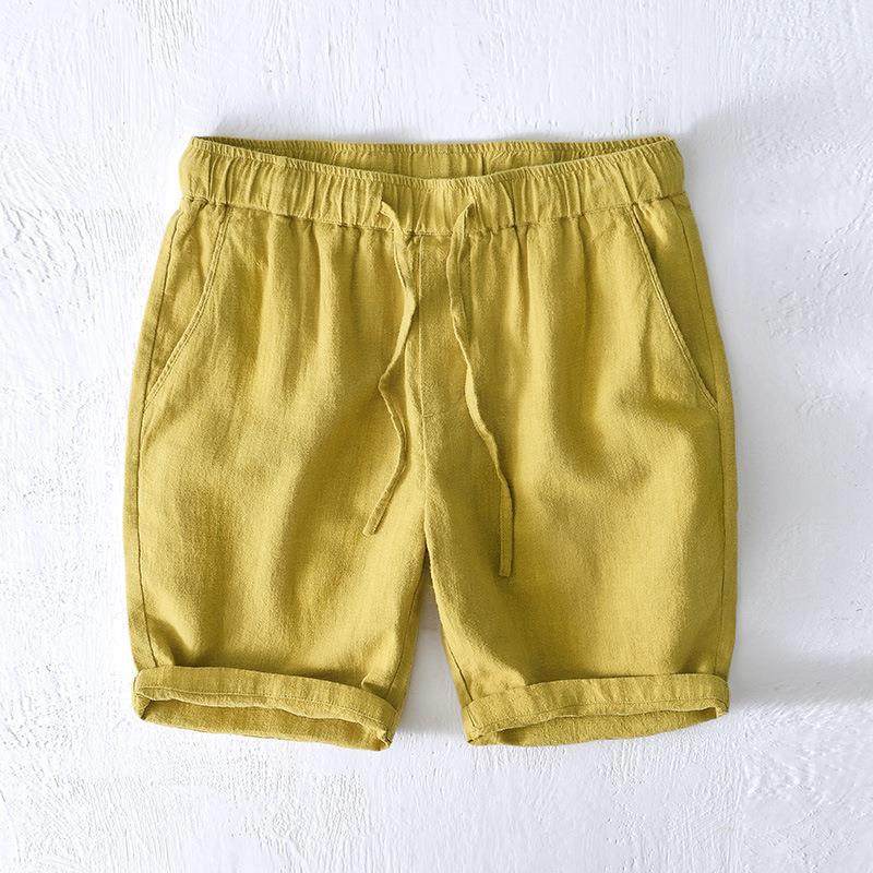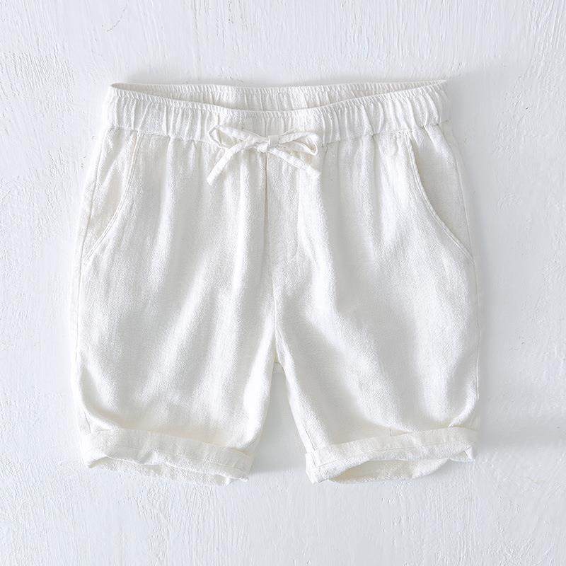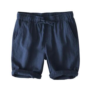 五分裤 夏季 宽松棉麻透气纯色男式 复古松紧腰抽绳休闲麻短裤 薄款