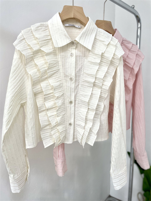 压褶多层荷叶边短款 S春款 上衣 超好看气质条纹长袖 FIVE 衬衫