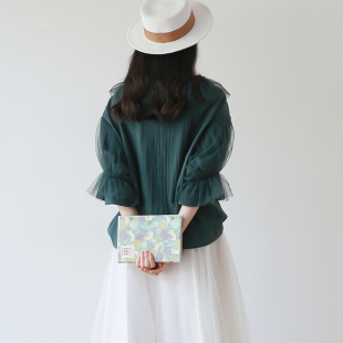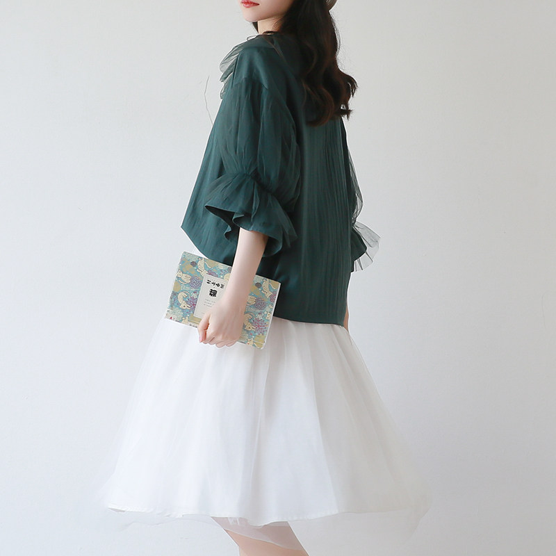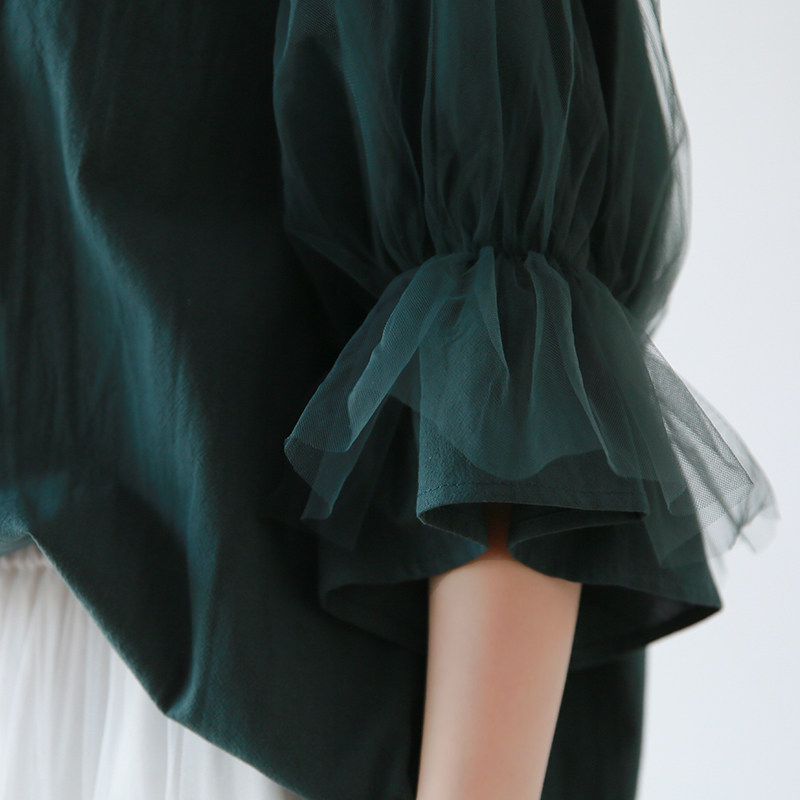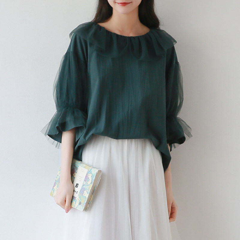 女宽松上衣 衬衫 2026春夏新款 文艺复古娃娃领绿色拼纱五分喇叭袖