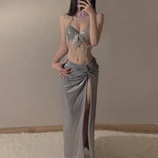 2024新款 亮闪闪泳衣女小胸钢托聚拢性感分体比基尼四件套 流苏罩衫
