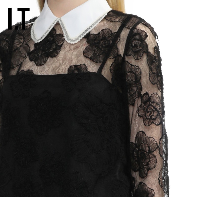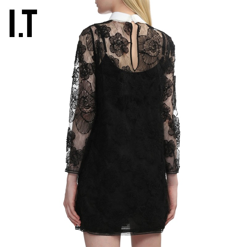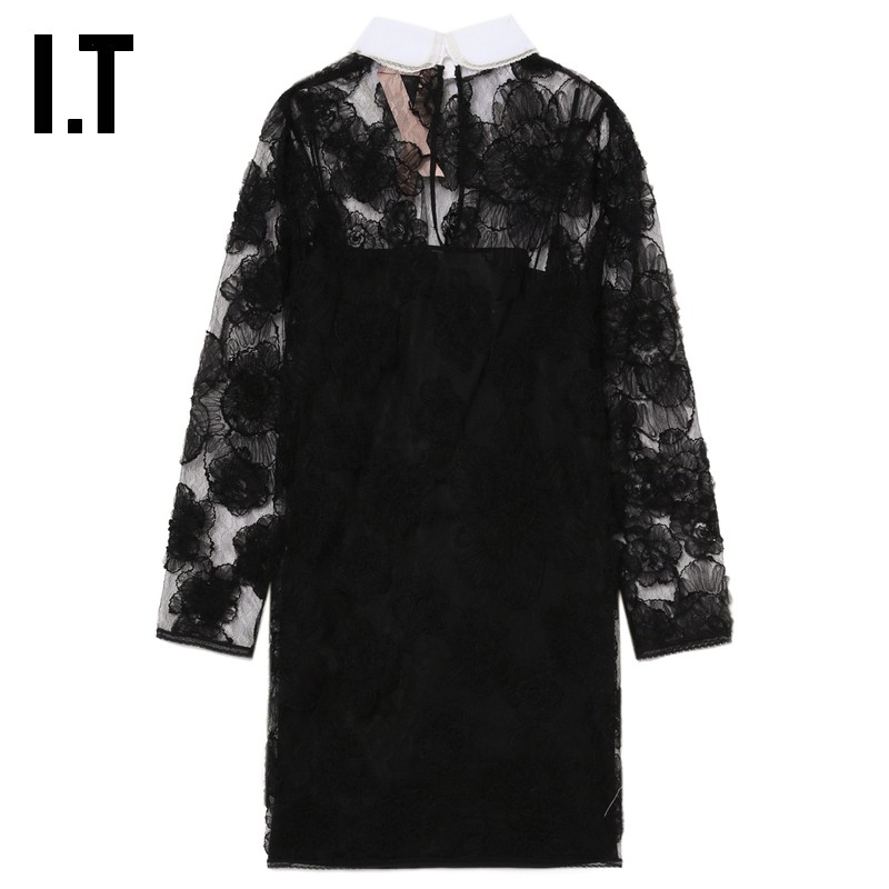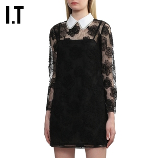 连衣裙新款 翻领九分袖 优雅气质蕾丝刺绣微透短裙034C0H N21女装