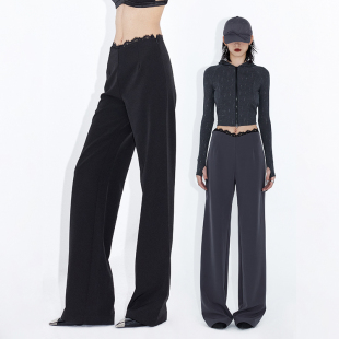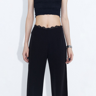 女夏设计感休闲长裤 ourhour 裤 黑色V腰宽松拖地西装 蕾丝花边