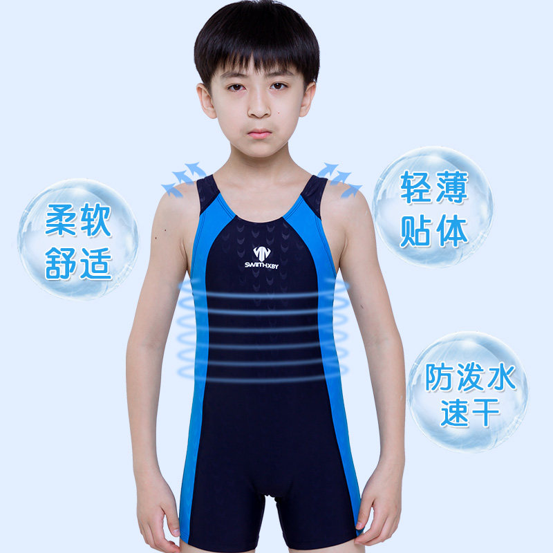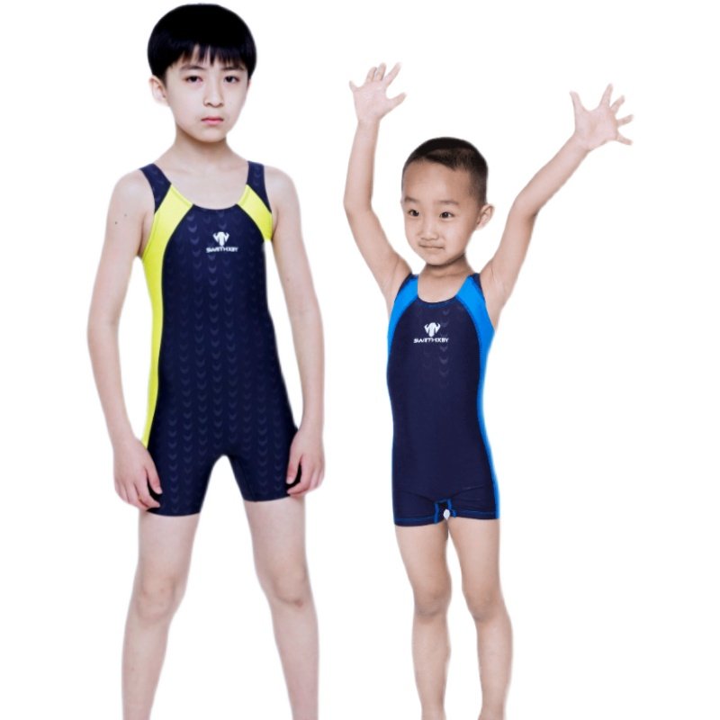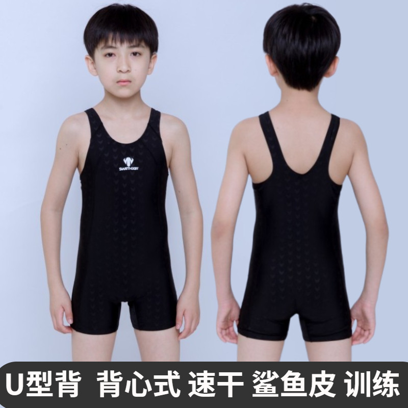 儿童泳衣男童夏中小童小孩无袖 鲨鱼皮专业训练平角连体游泳衣速干