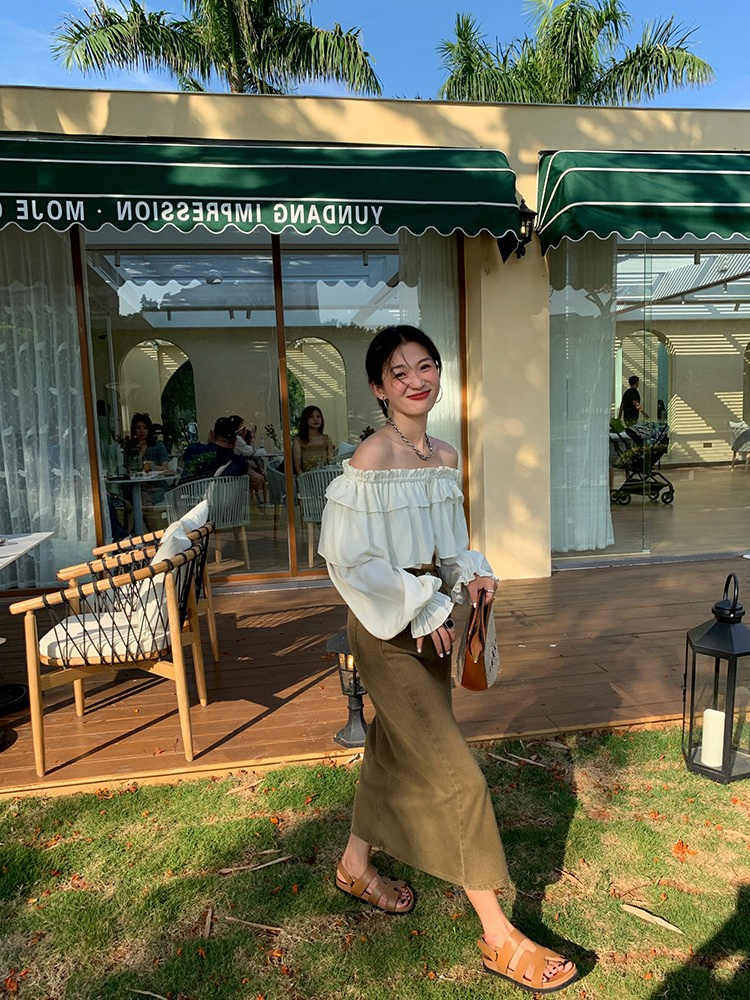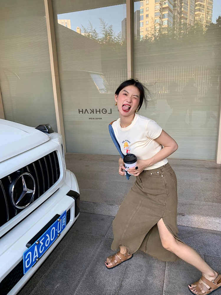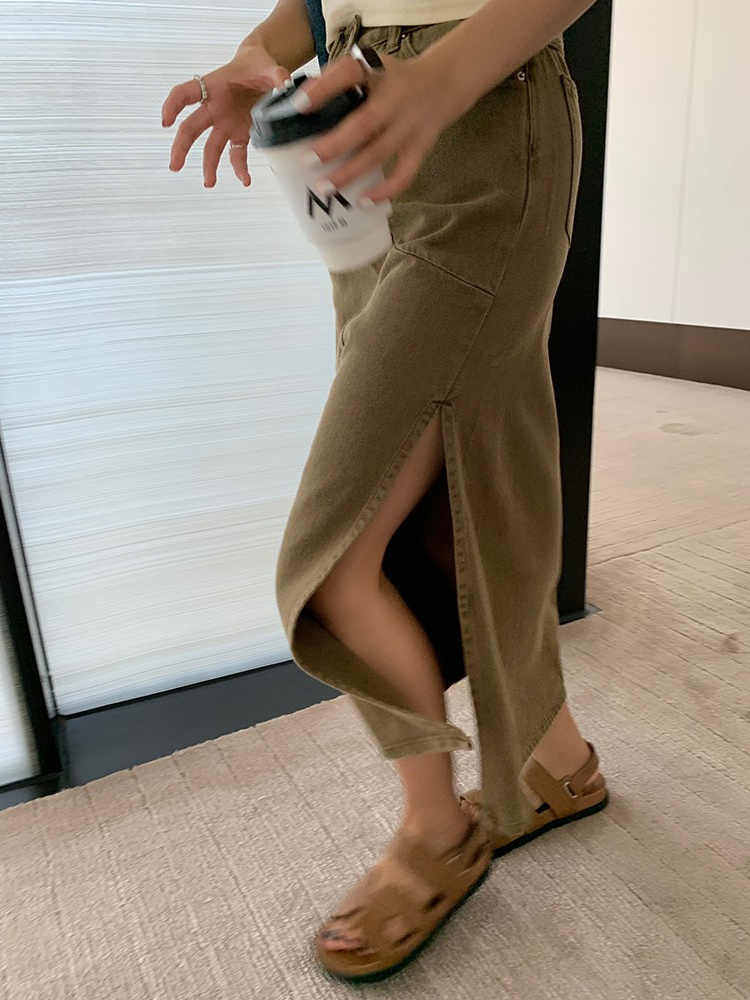 大码 微胖妹妹mm卡其色牛仔夏高腰宽松遮胯显瘦开叉中长半身裙 女装