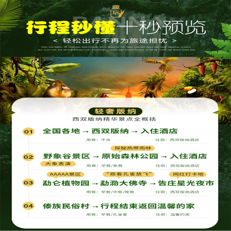 云南西双版 纳4天3玩跟团旅游游昆明出发高铁往返精华景点野象谷