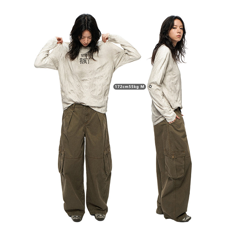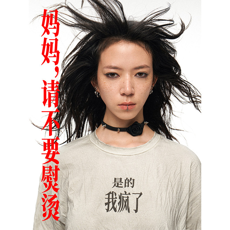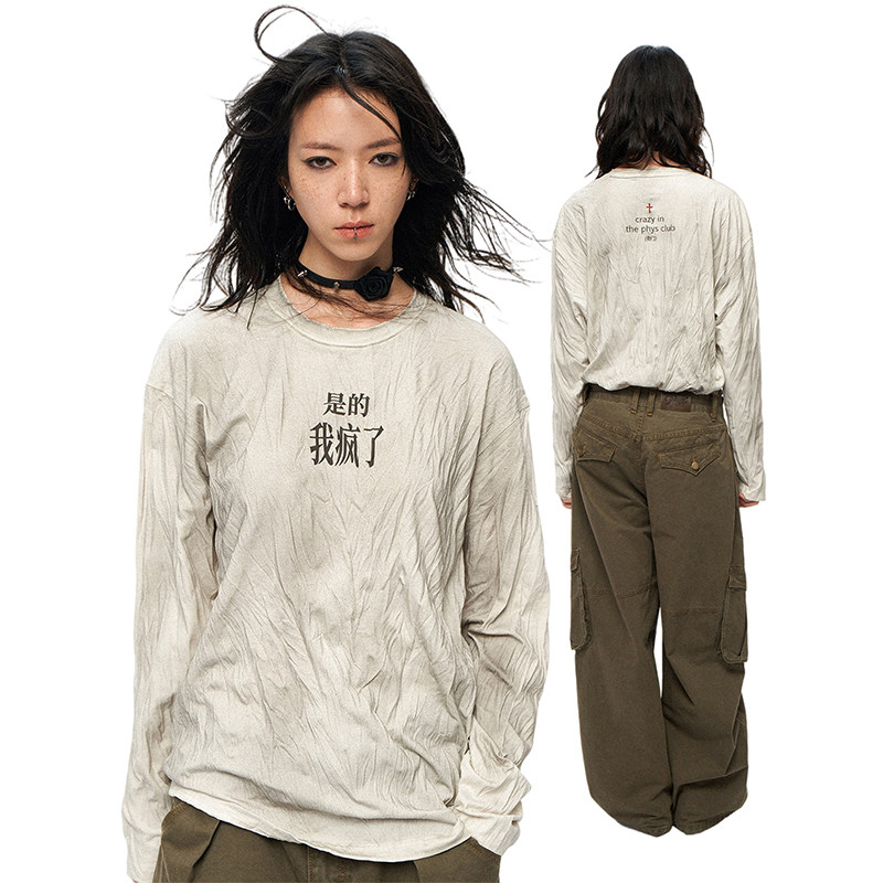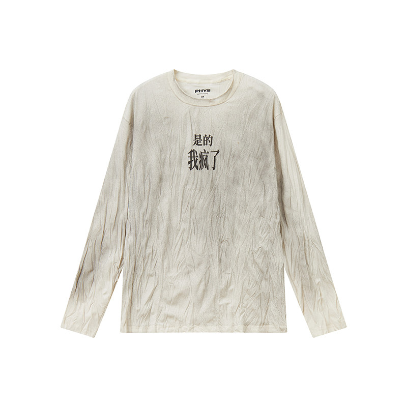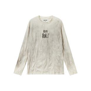 喷脏拧皱直筒宽松做旧长袖 我疯了 T恤 是 物理少年「我疯了」