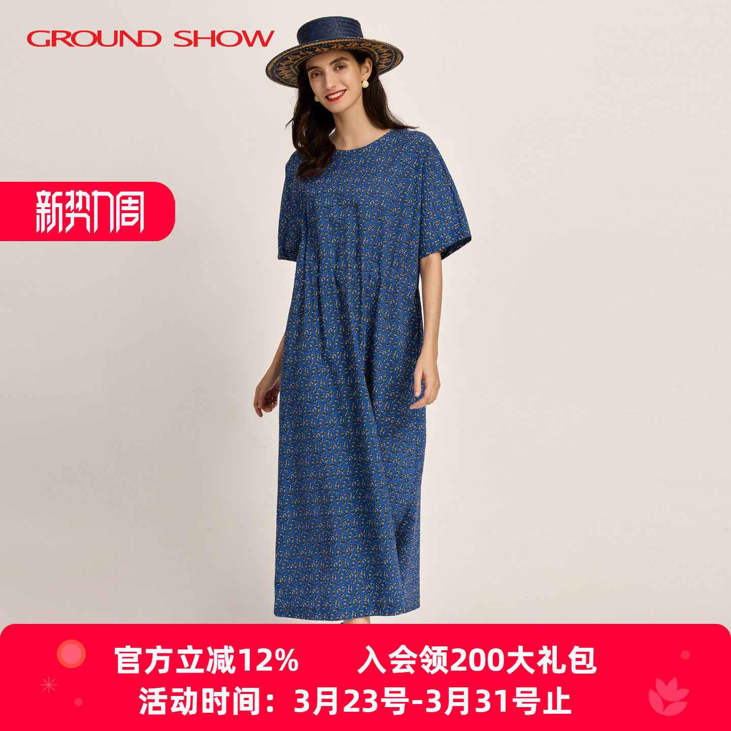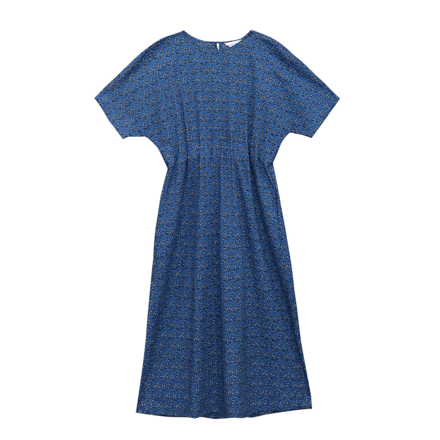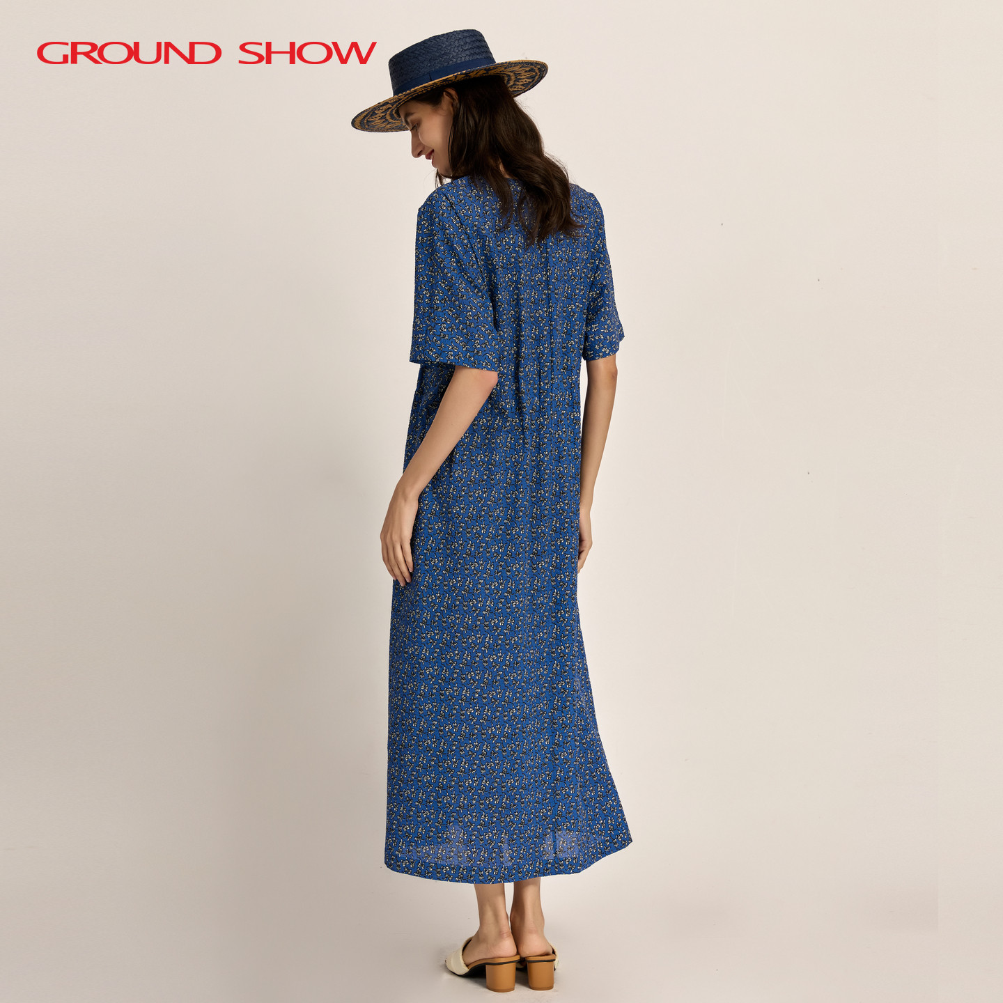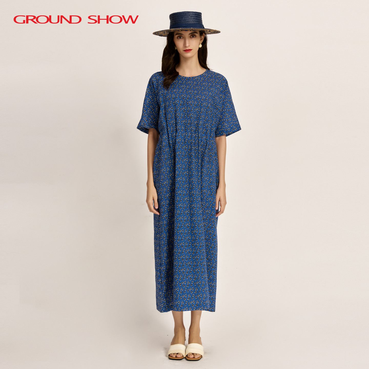 蓝色印花肌理感连衣裙束腰型长裙子全棉女装 阁兰秀2026夏季 五分袖