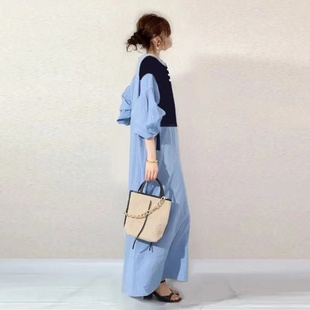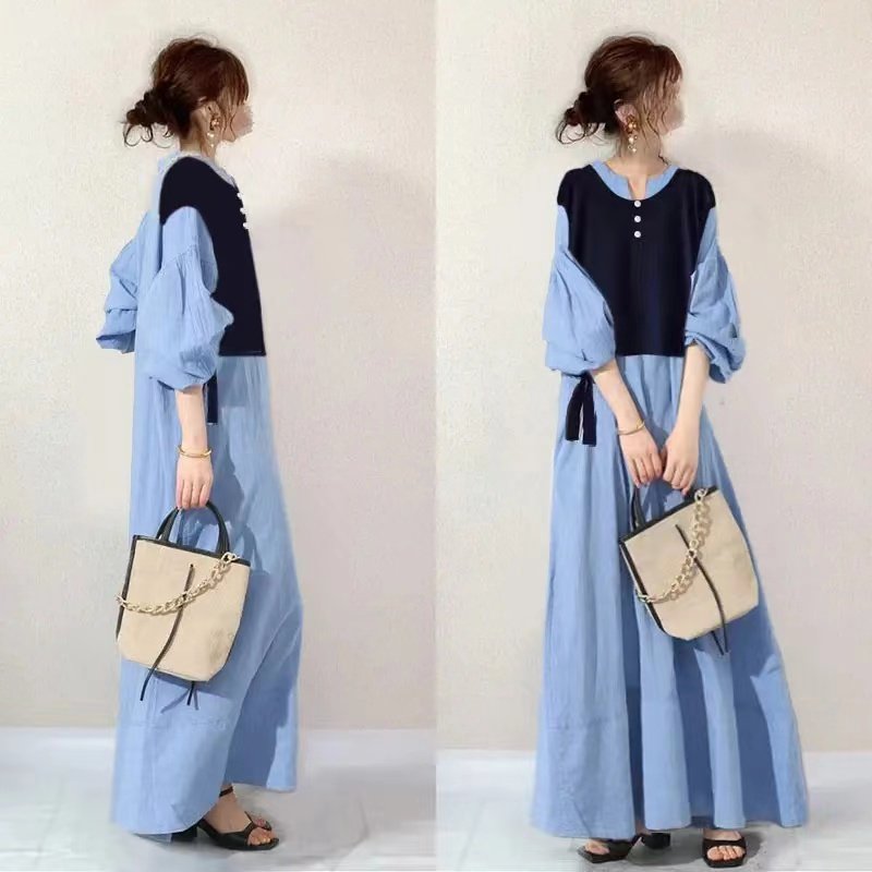 long 2023日系乐天爆款 two Fake dresses 假两件拼接撞色连衣裙