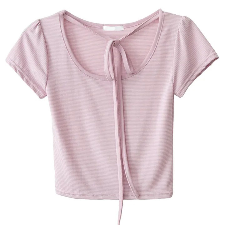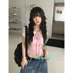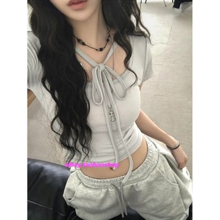 显瘦短款 eihey诶嘿夏季 T恤修身 甜酷系带挂脖条纹短袖 百搭上衣 新款