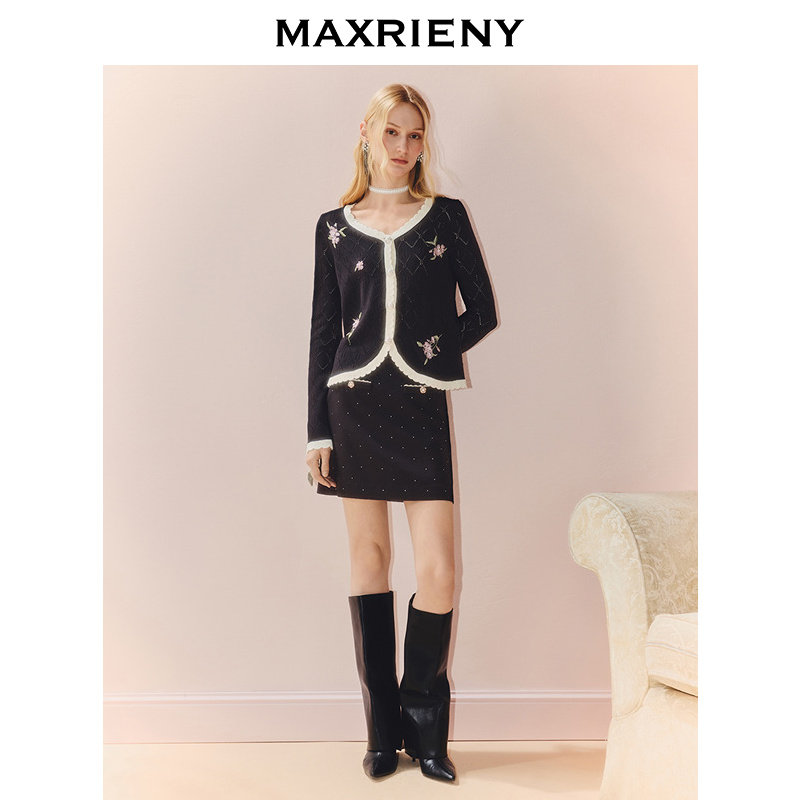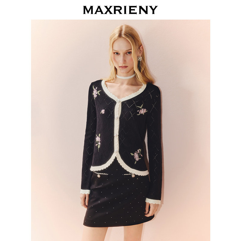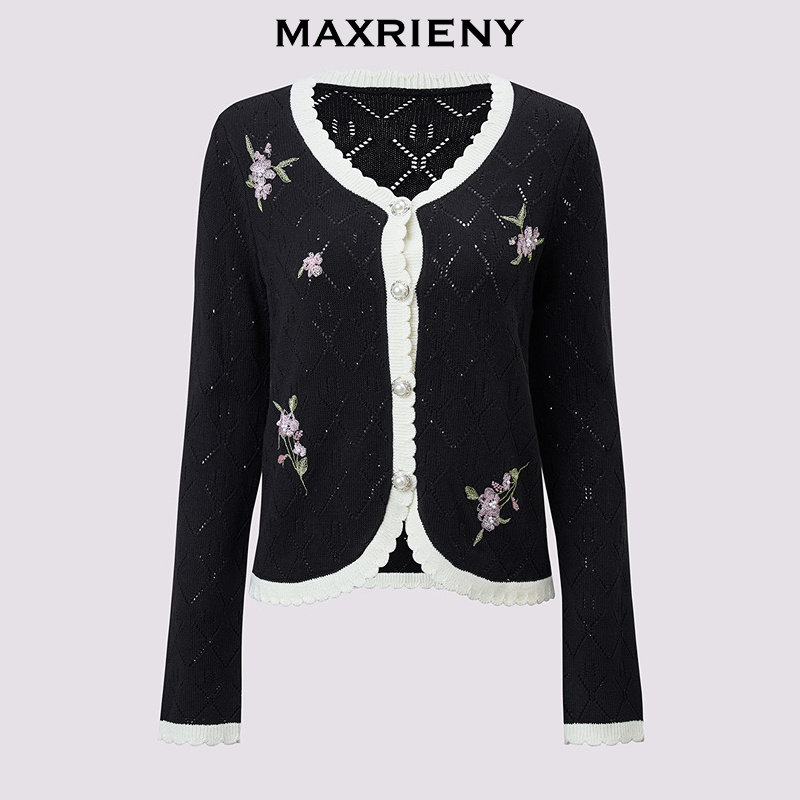 上衣女 长袖 MAXRIENY千金优雅感绣花撞色针织外套25秋款 收腰修身