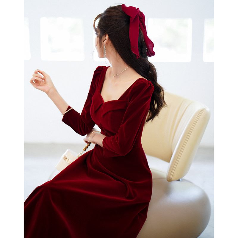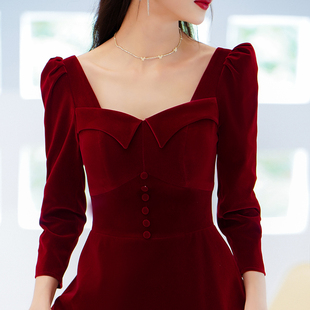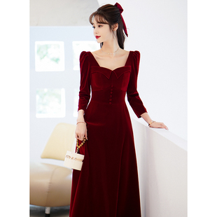 敬酒服新娘丝绒高级感小个子订婚连衣裙法式 回门礼服女酒红色长袖