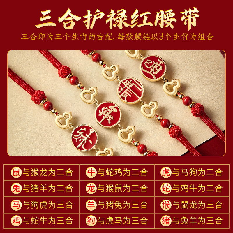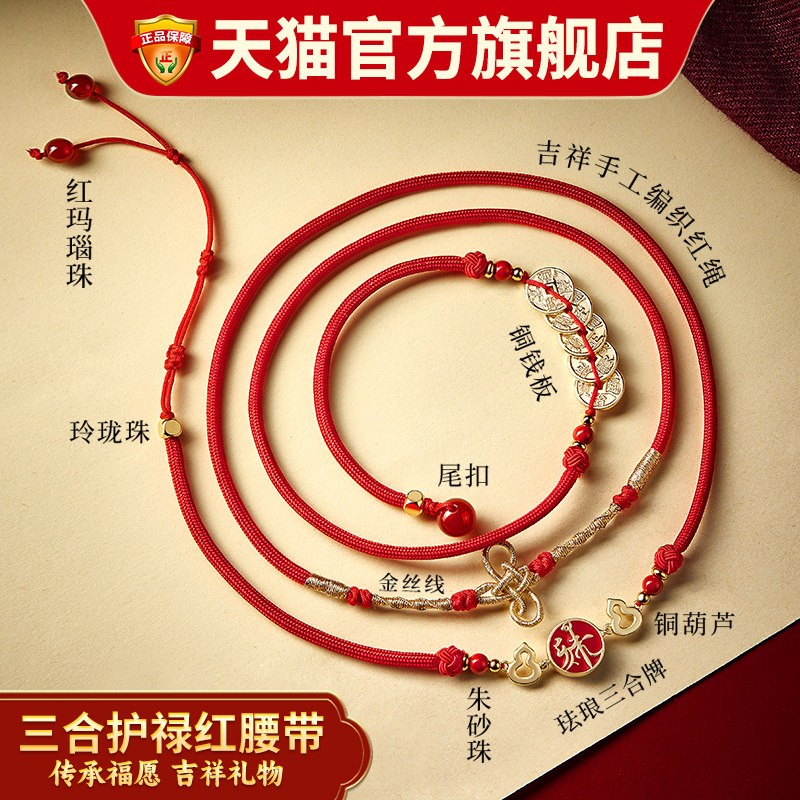淘运阁三合护禄吉宏红腰带2026马年本命年红绳腰链女男朱砂生肖绳