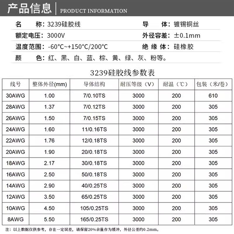 200度高温导线 20AWG柔软耐高温 3KV高压电线 3239硅胶线24