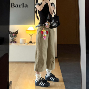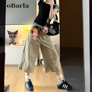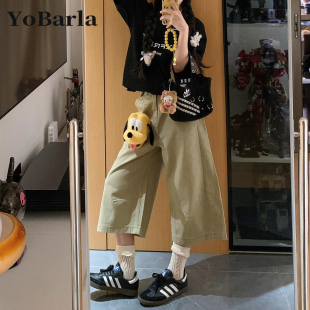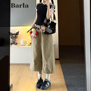 胖mm宽松显瘦梨形身材阔腿裤 大码 子 女夏新款 卡其色直筒牛仔七分裤