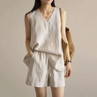 新款 2025夏季 棉麻无袖 背心上衣薄款 两件套女 单 宽松透气短裤 套装