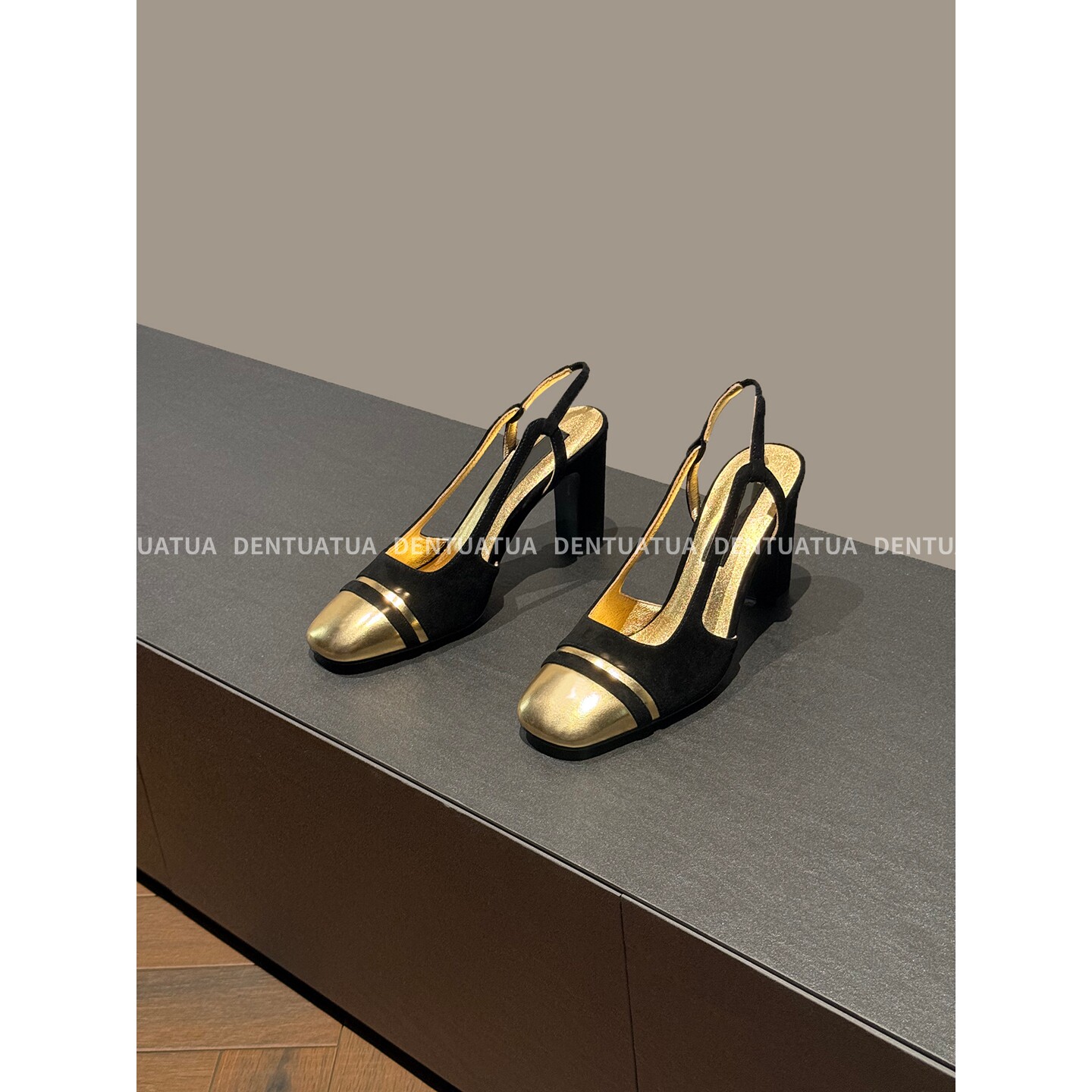 拼色方头粗跟包头凉鞋 DENTUATUA 25ss 气质 女 独树一帜