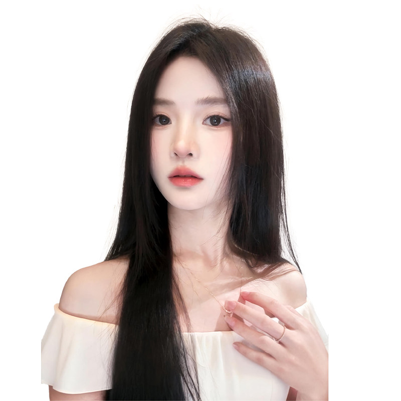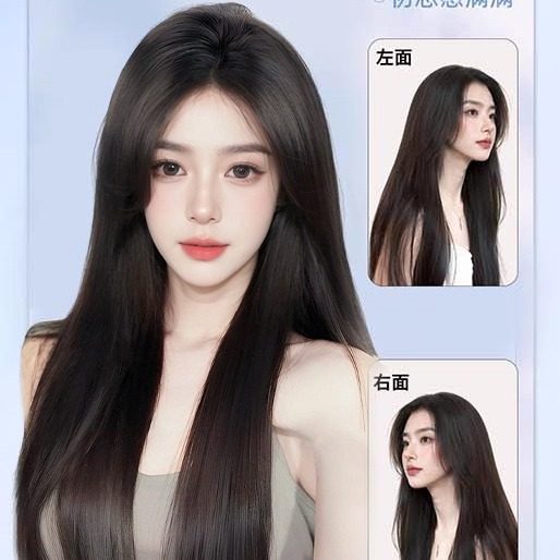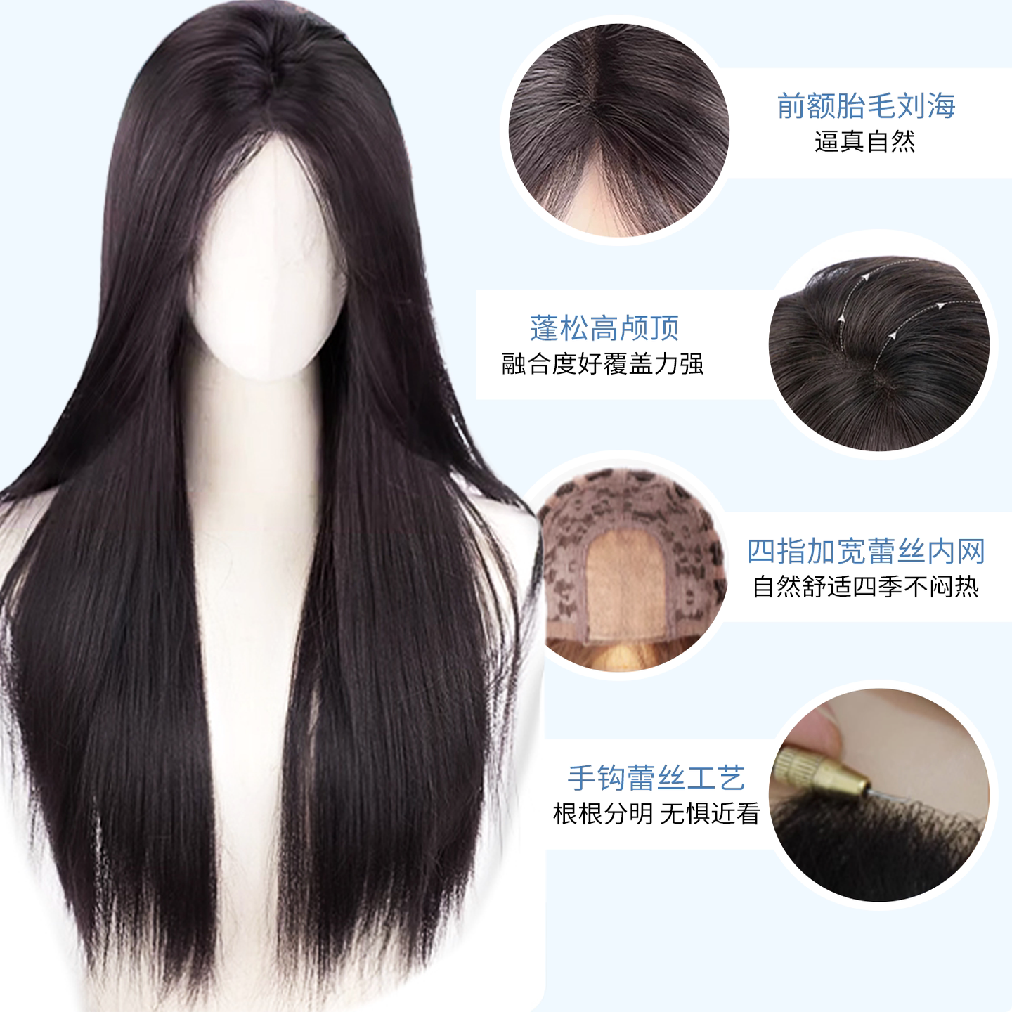 假发全头套前额蕾丝无痕蓬松黑长直轻薄头顶真发中分白月光假发套