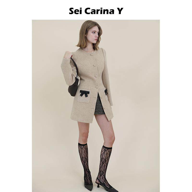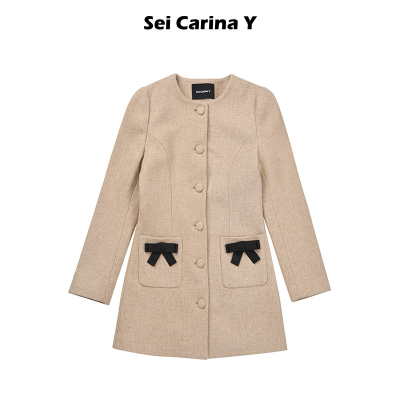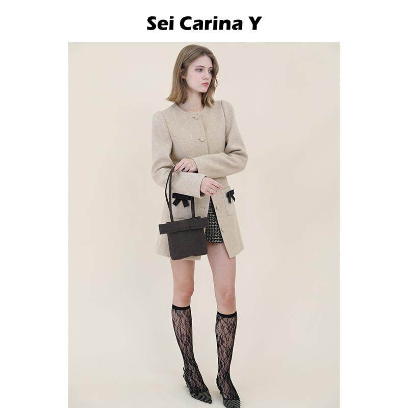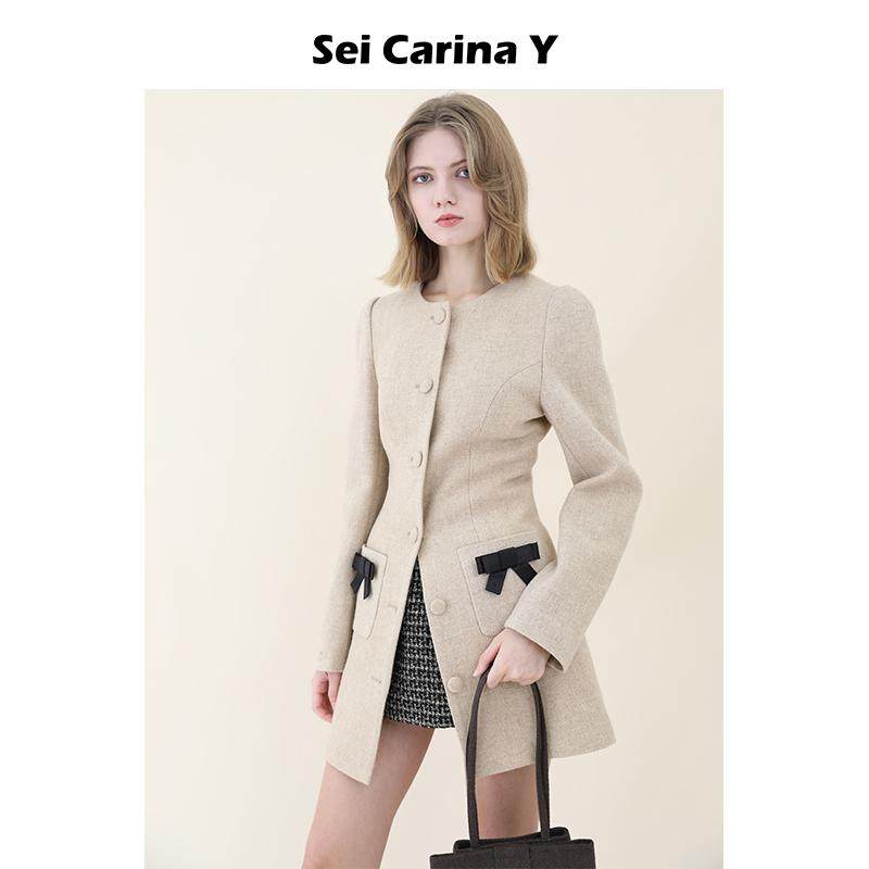 收腰大衣秋冬新款 Sei 外套修身 Y口袋蝴蝶结毛呢中长款 女 Carina