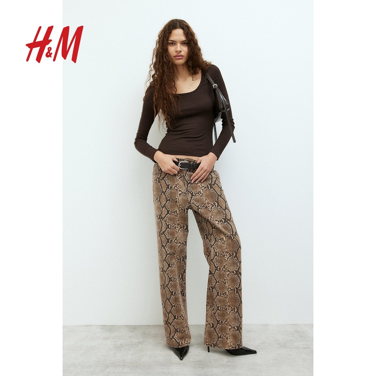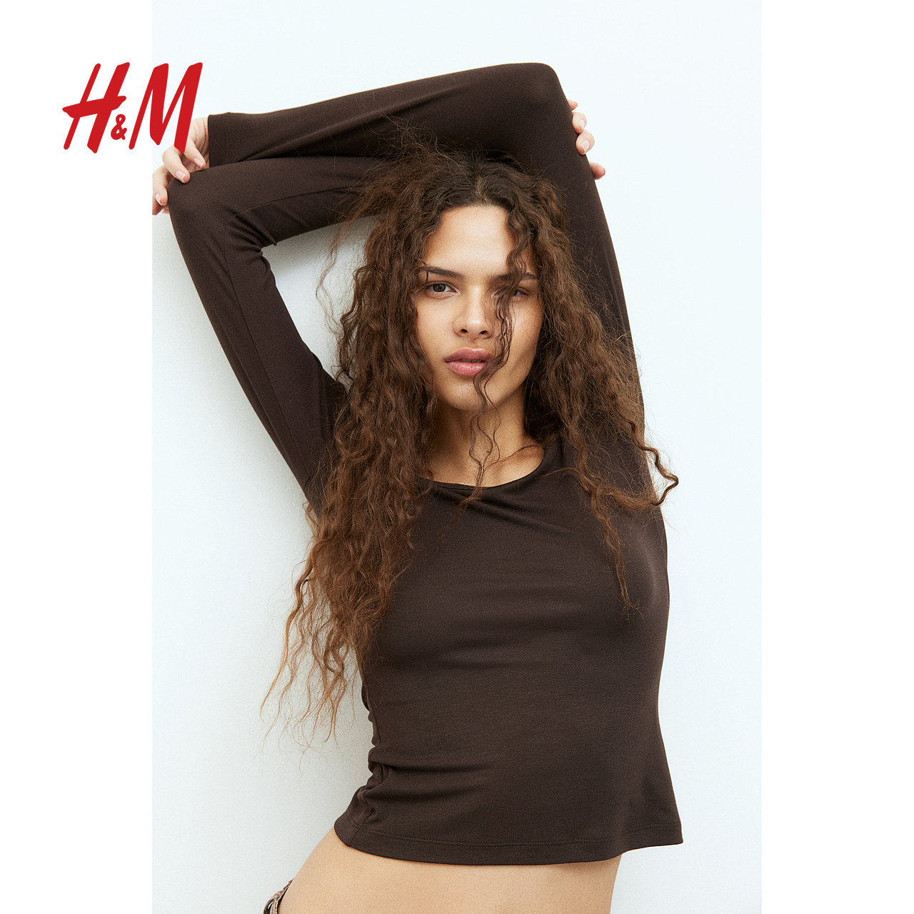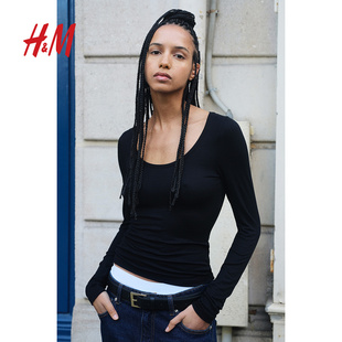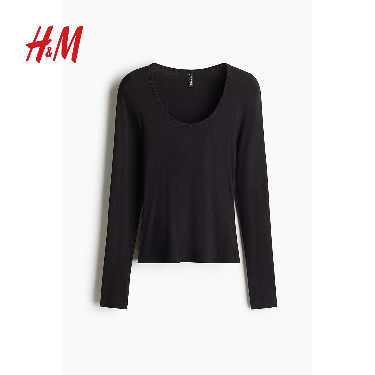 T恤2025冬季 直筒下摆长袖 新款 低圆领修身 上衣1259455 时尚 HM女装