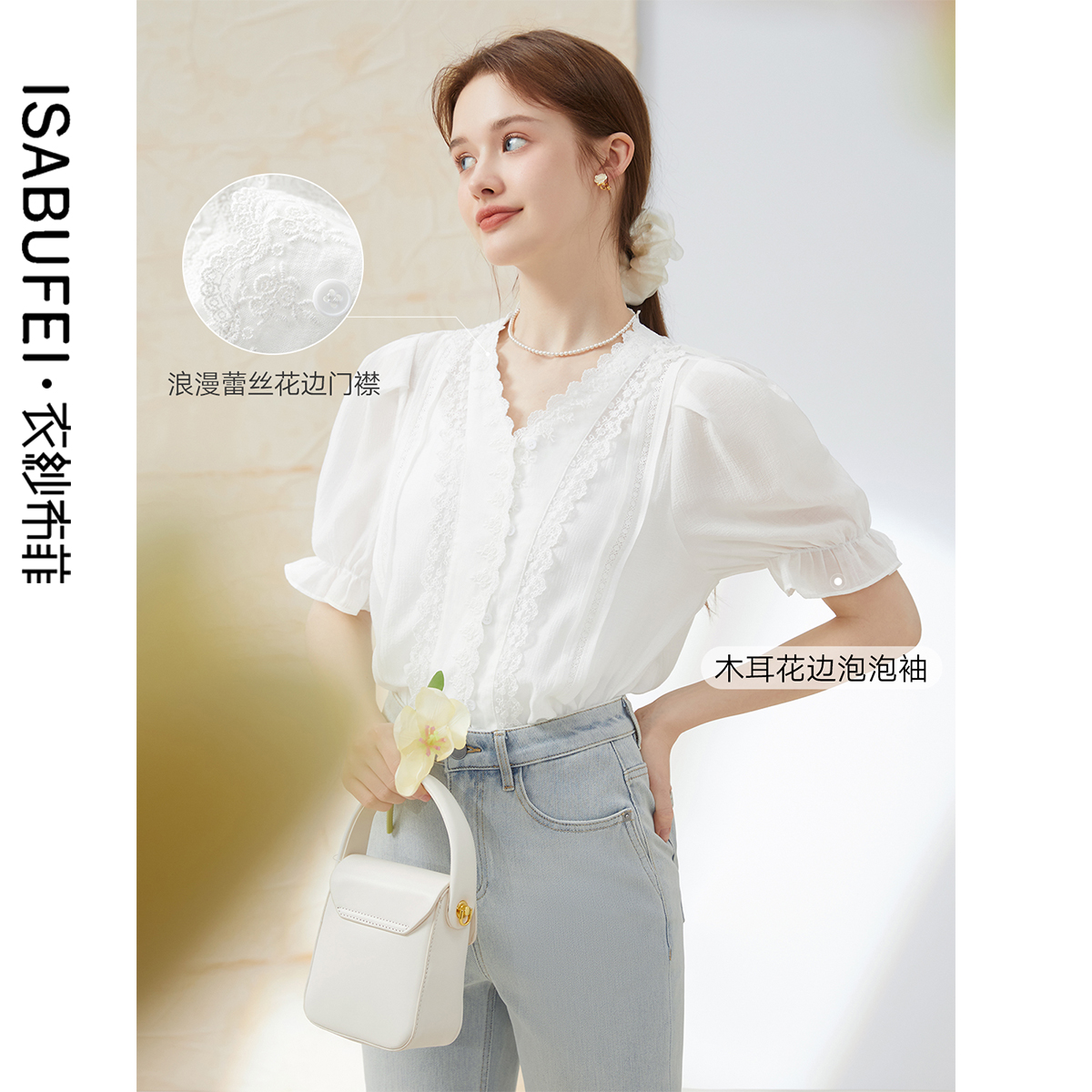 别致雪纺衫 泡泡袖 洋气白色蕾丝上衣女夏装 衣纱布菲冰樱