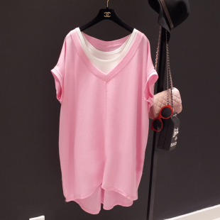 纯色上衣夏两件套韩版 2026夏季 t恤女中长款 V领短袖 宽松体恤裙 新款