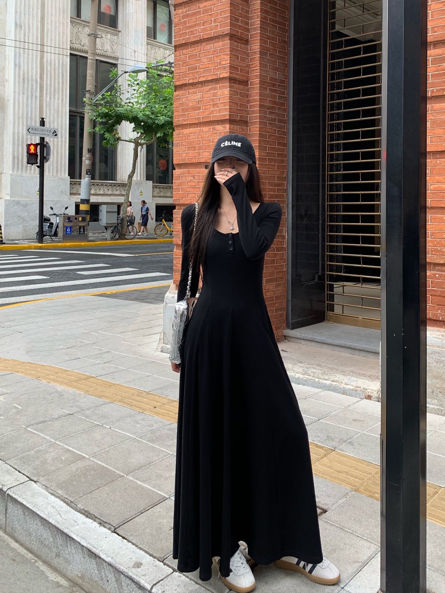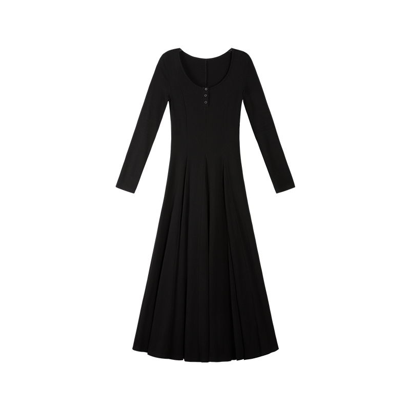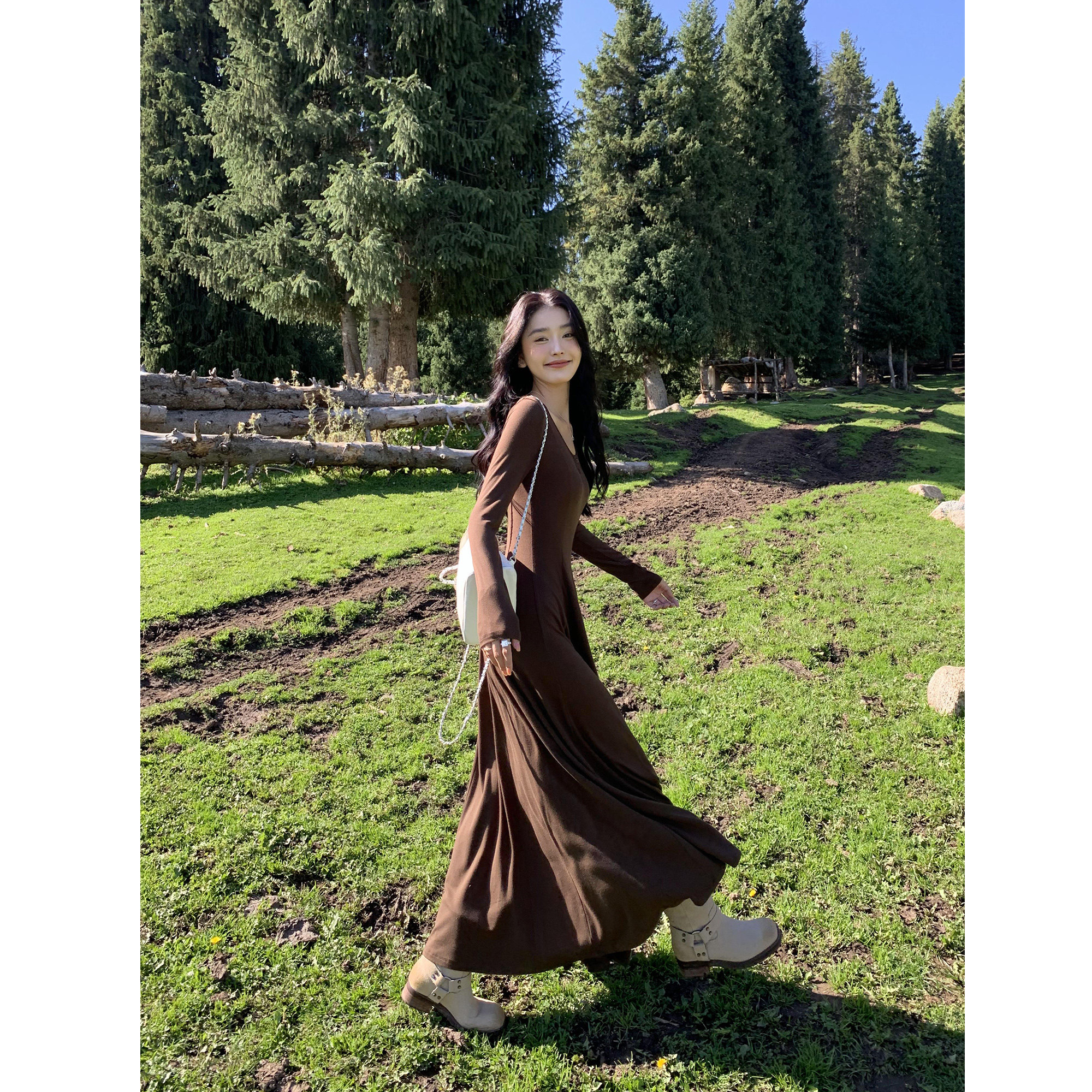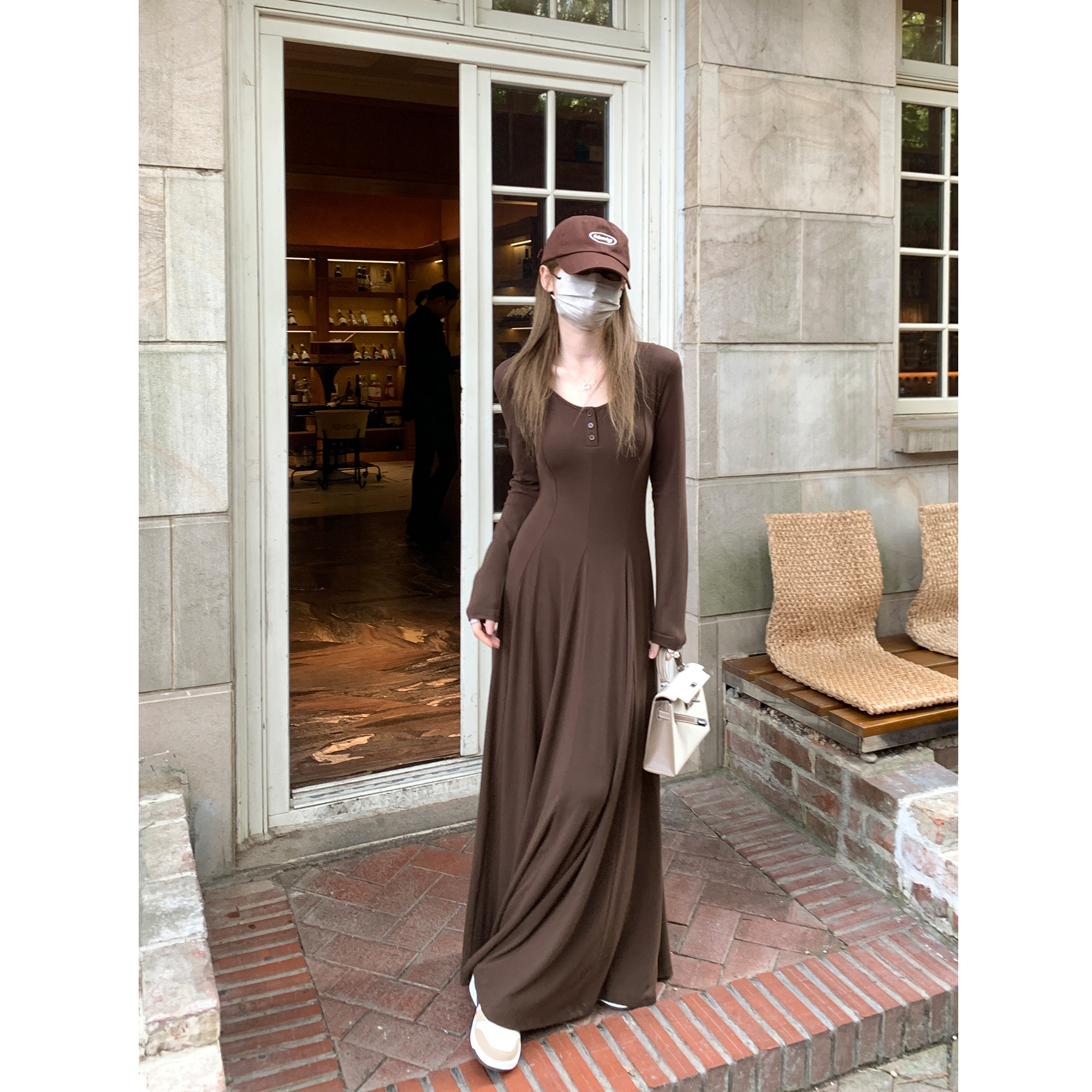 连衣裙针织裙女秋季 长袖 U领收腰打底大摆长裙 现货6折 辰米范