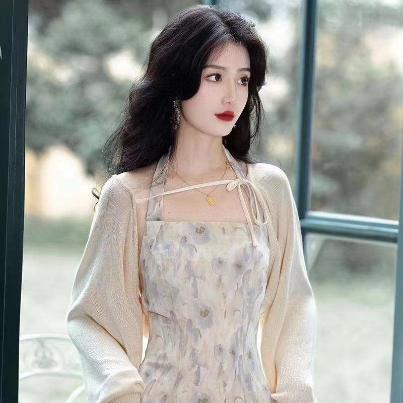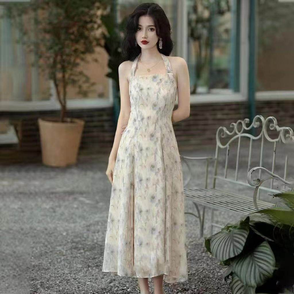 印花连衣裙女海岛裙度假 NanaJacqueline挂脖花边长款 李梦同款