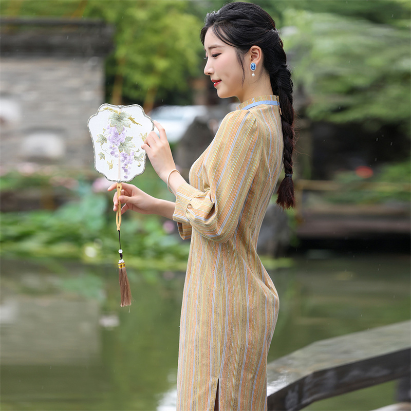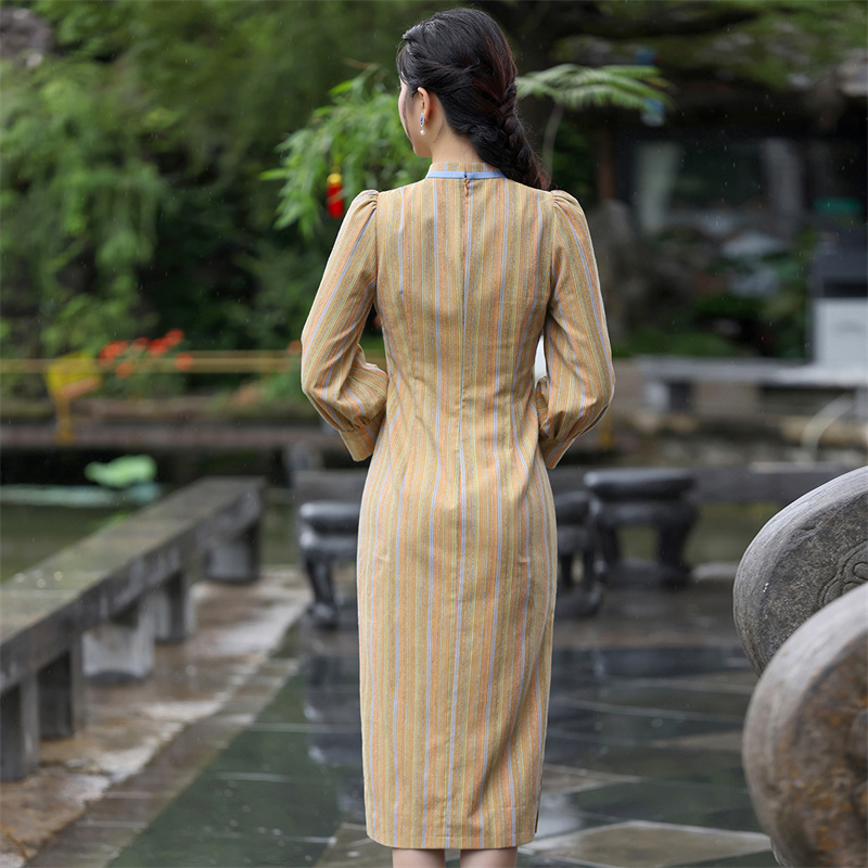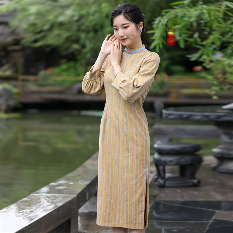 改良款 修身 条纹崔万志旗袍连衣裙 旗袍复古民国风长袖 蝶恋春秋款