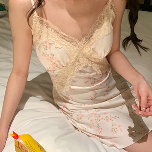 馨帮帮 性感蕾丝边带胸垫睡裙家居服 甜美碎花冰丝吊带睡衣女夏季