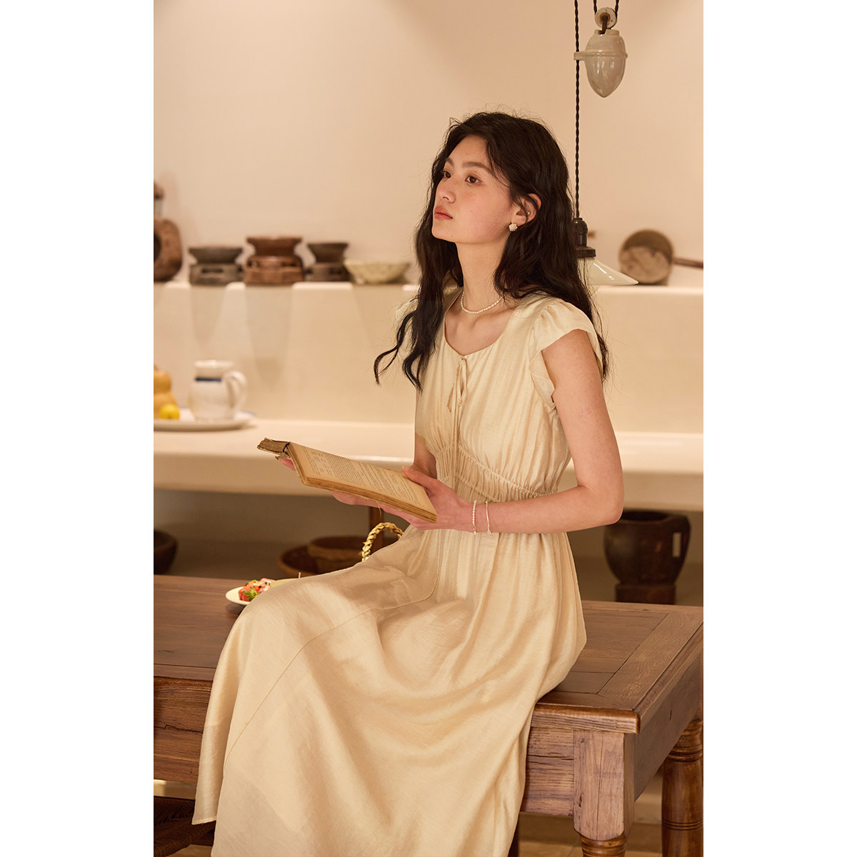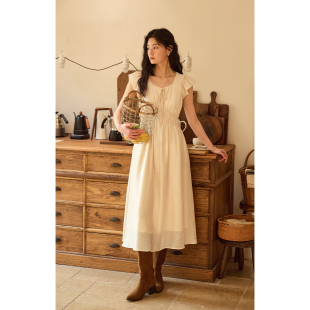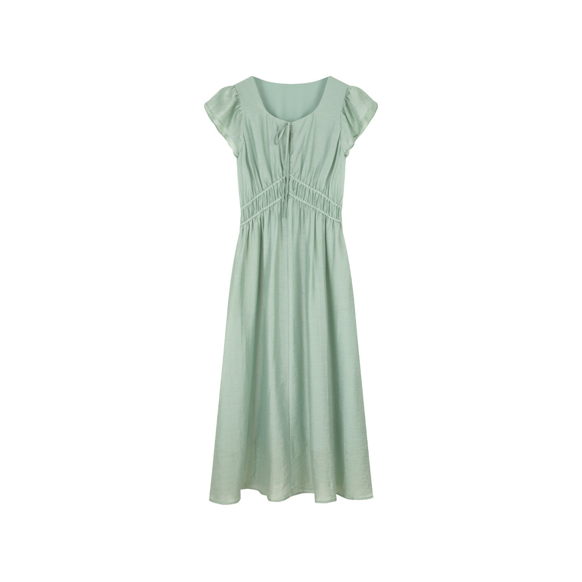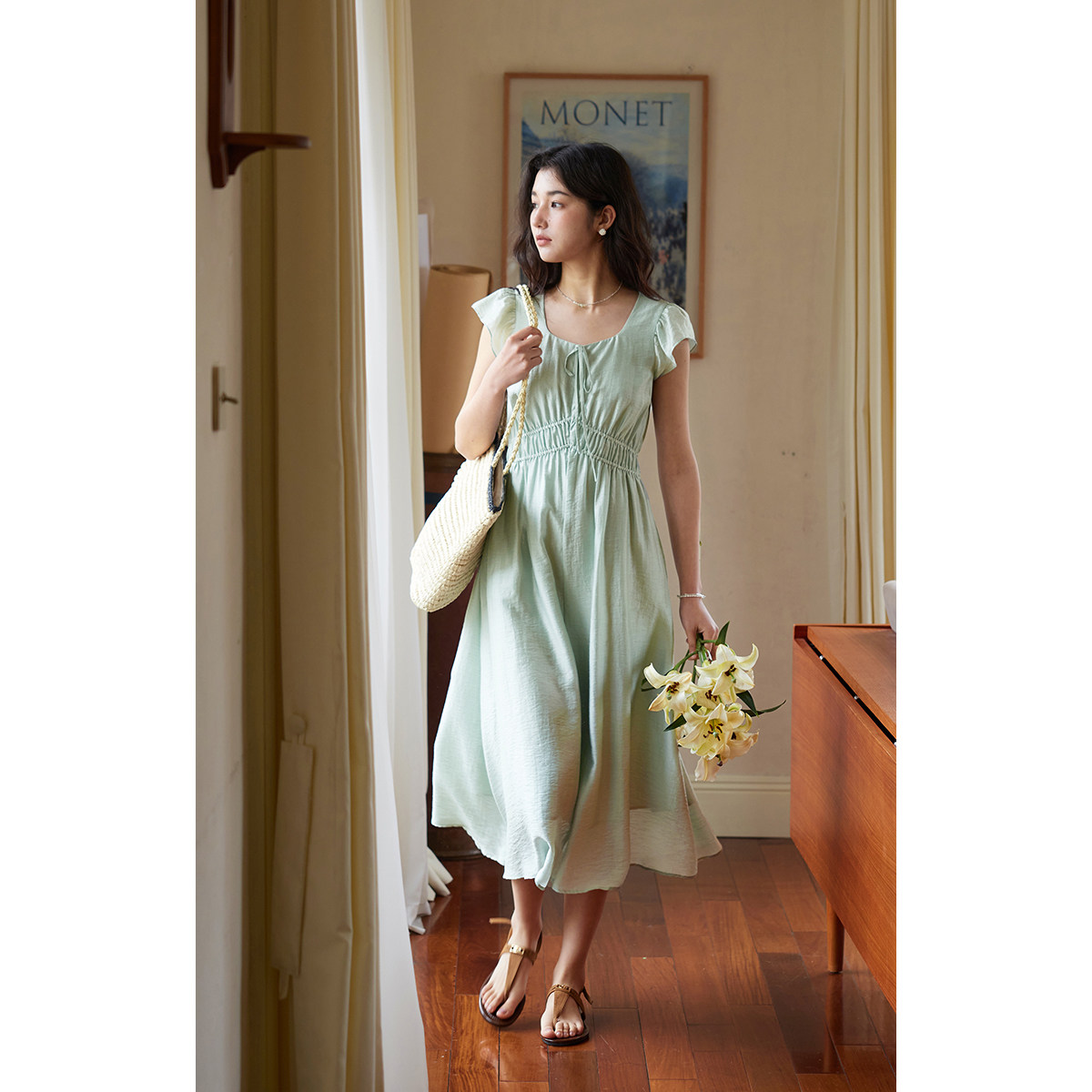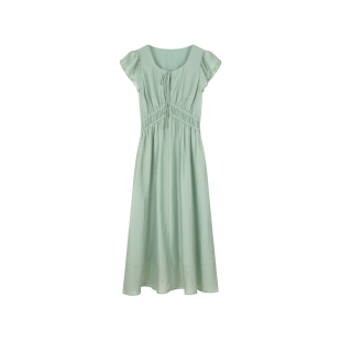 2025新款 solighter 连衣裙女夏季 天丝亚麻绿色小飞袖 收腰长裙 法式