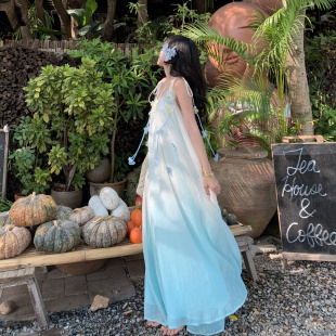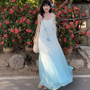 韦小小「蓝雾织梦」渐变蓝度假风仙气重工裙立体花朵吊带气质法式