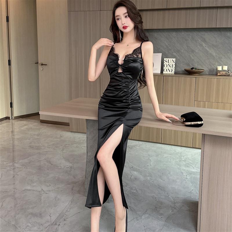 蕾丝性感拼接豹纹缎面包臀连衣裙夜场女装 高级感深V领晚礼服长裙