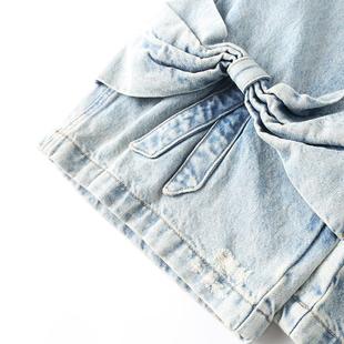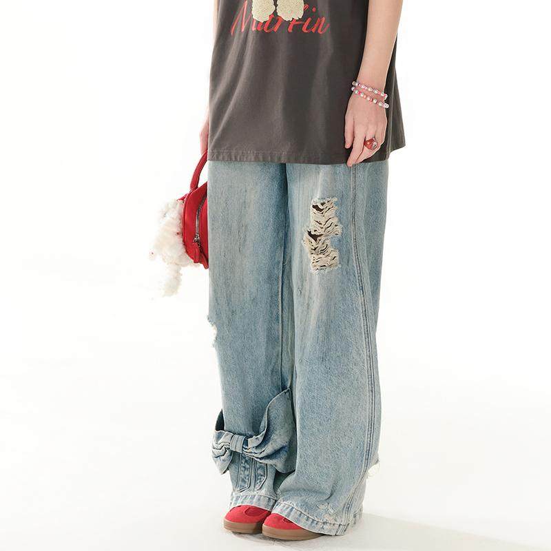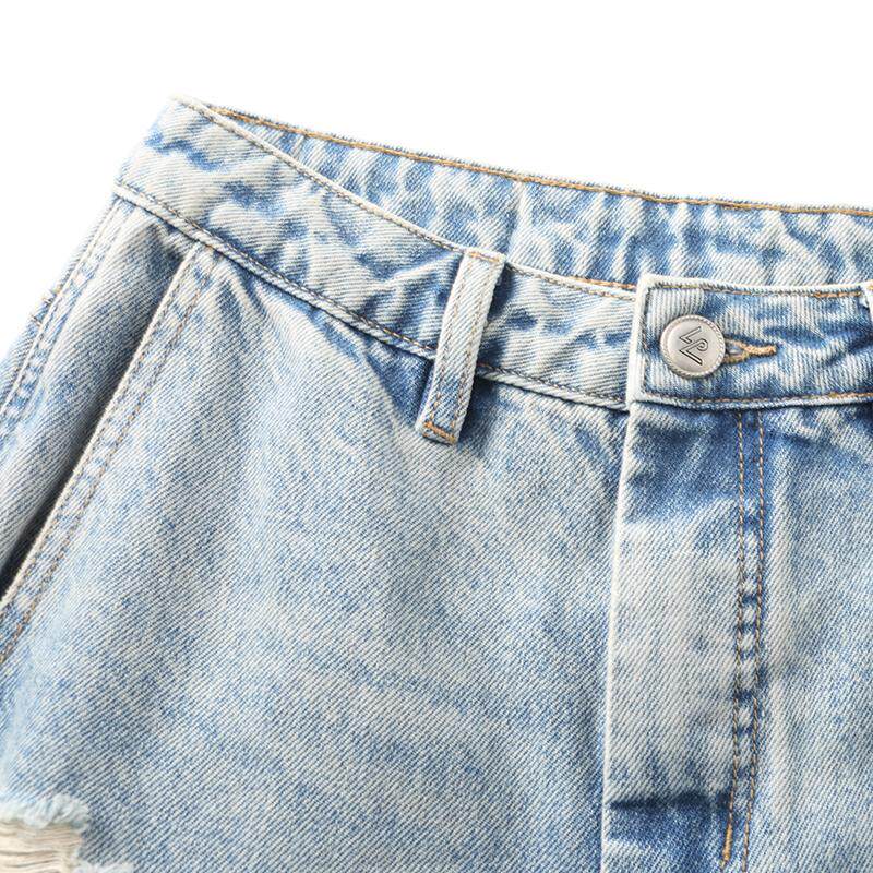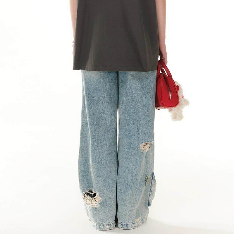 女设计感长裤 水洗蓝做旧破洞毛边阔腿牛仔裤 假两件拼接 ourhour